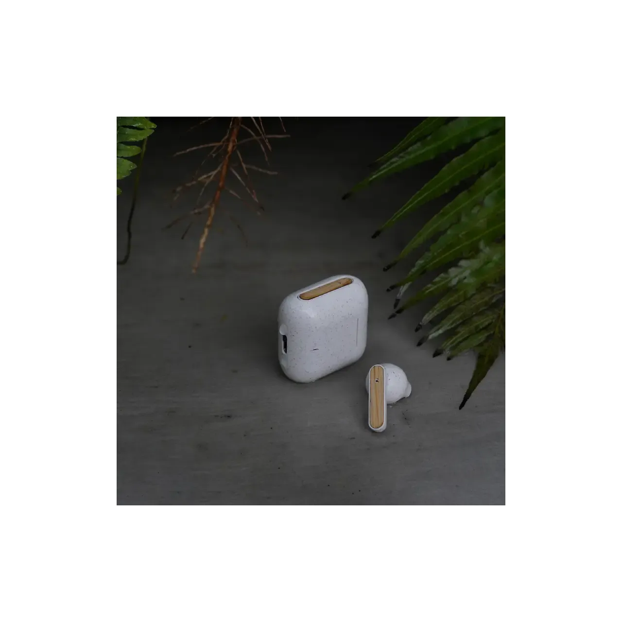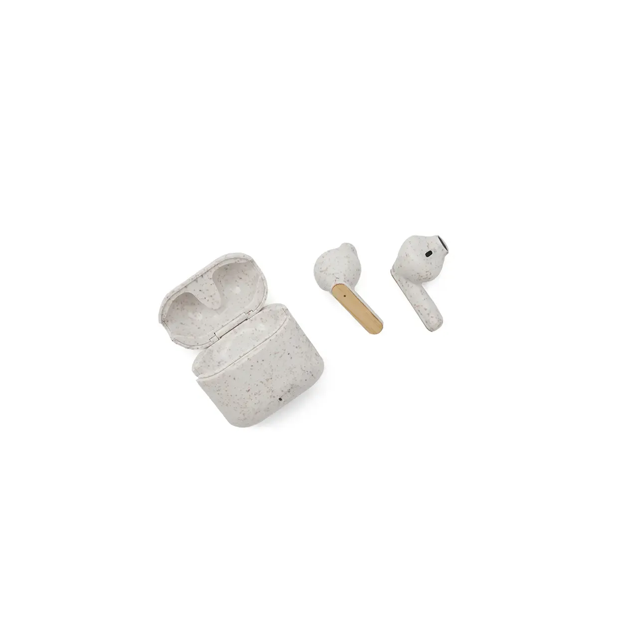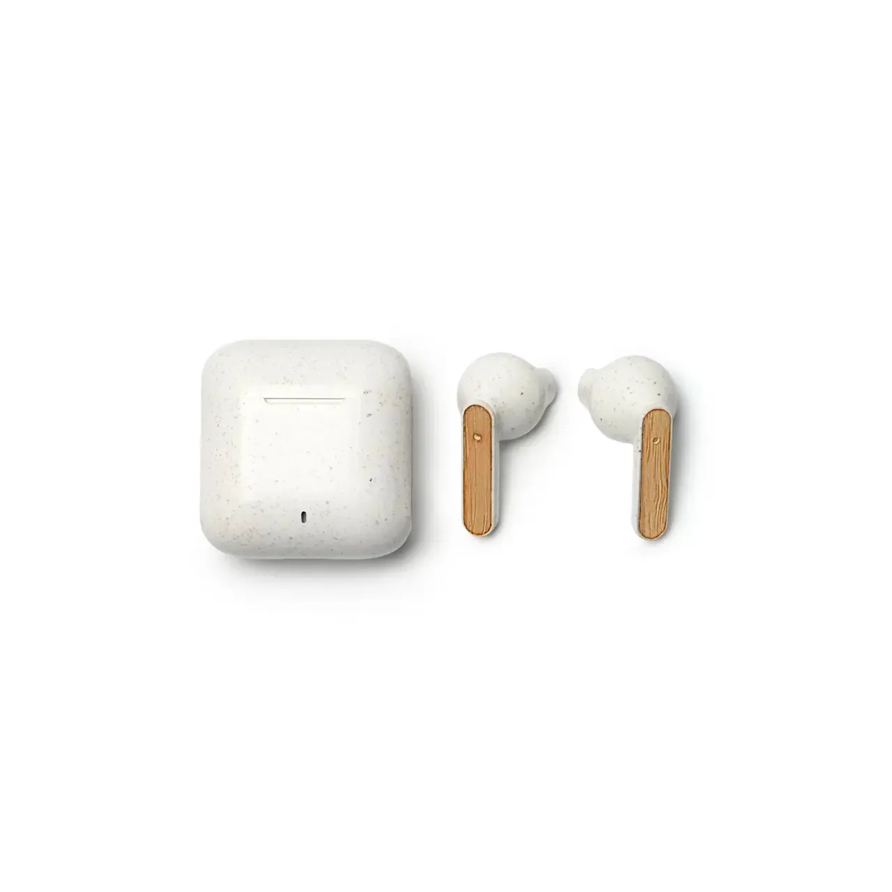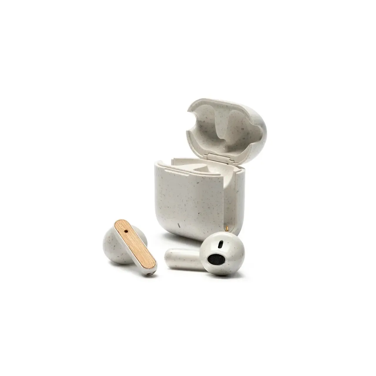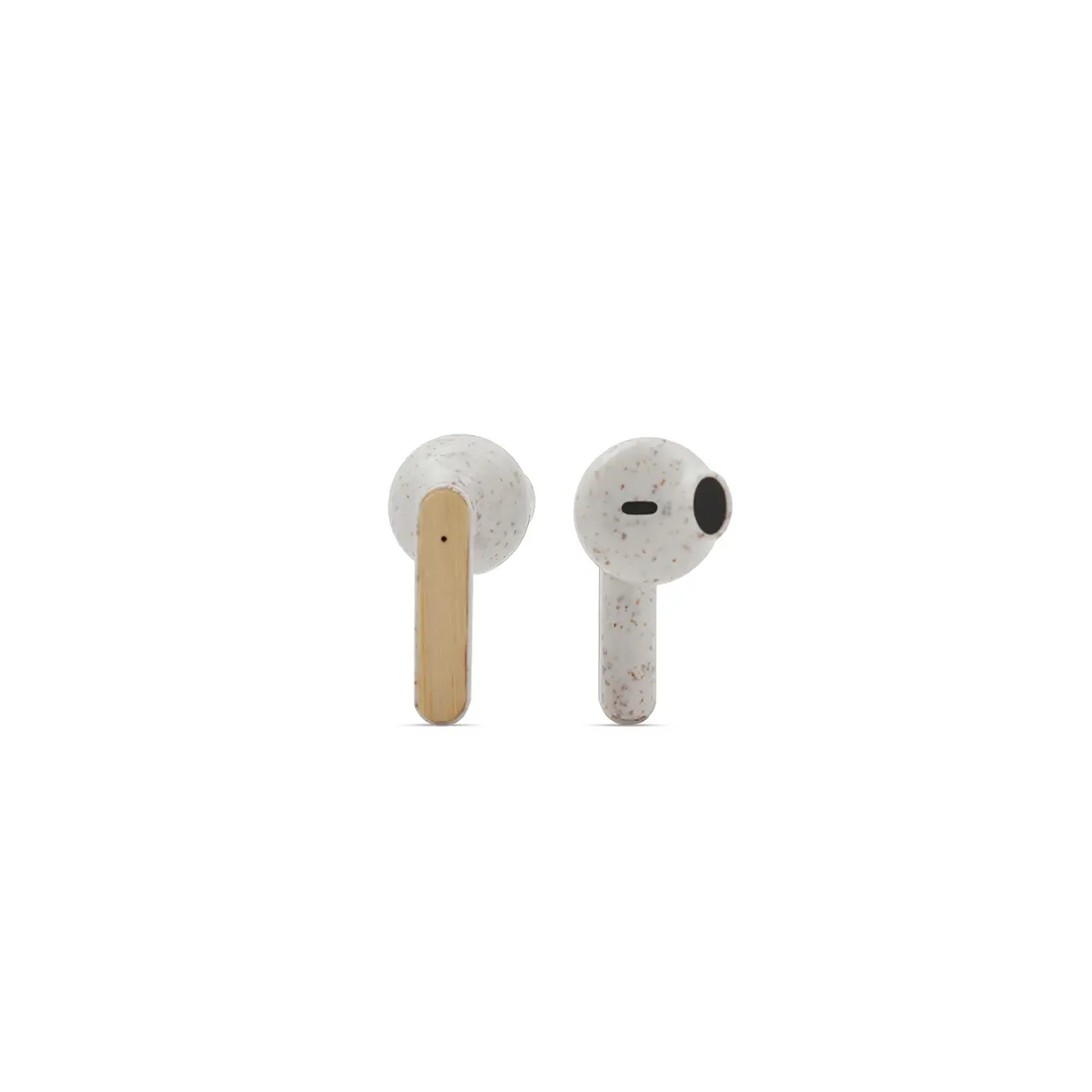 Auriculares inalámbricos fabricados en bambú, ABS y Wheat Straw, pasta de tallo de trigo, un material sustentable que reduce el consumo de plásticos vírgenes. Cada auricular cuenta con un botón touch que permite: contestar y finalizar llamadas, reproducir y pausar música, cambiar a la siguiente o anterior canción, subir y bajar el volumen y acceder al asistente de voz. Tienen tecnología Bluetooth 5.3, una duración de batería de aproximadamente 3.5 horas y un estuche de carga de 200 mAh, el cual se carga a través de un cable usb c. Los auriculares vienen dentro de una caja de cartón junto a su manual de instrucciones y cable cargador.