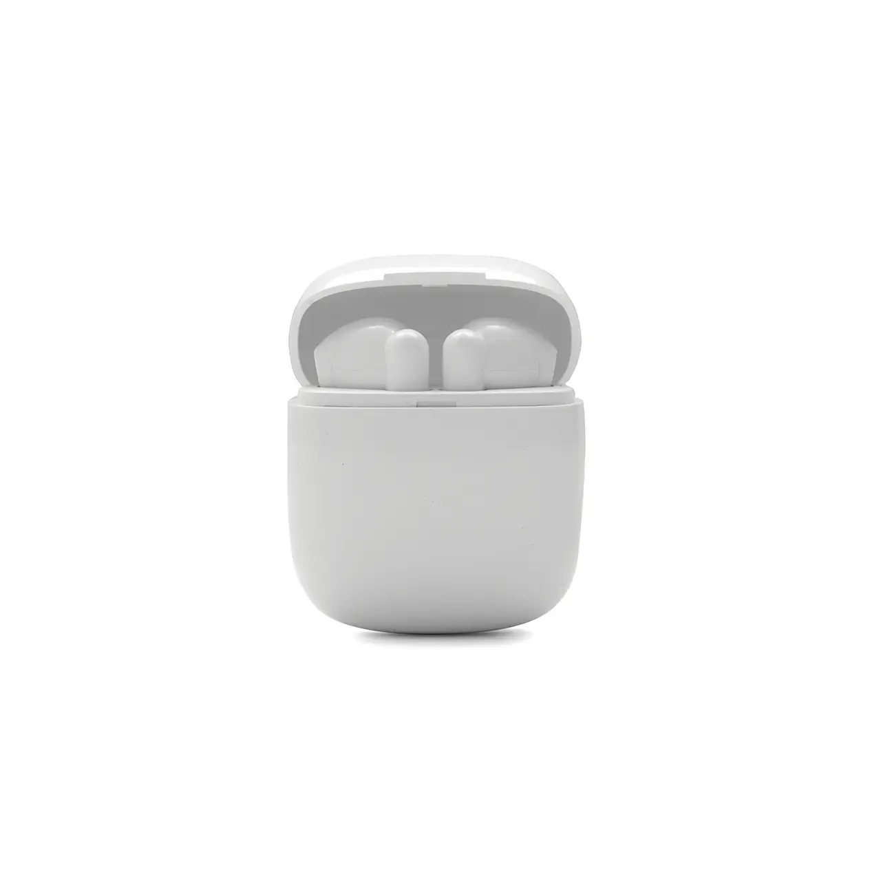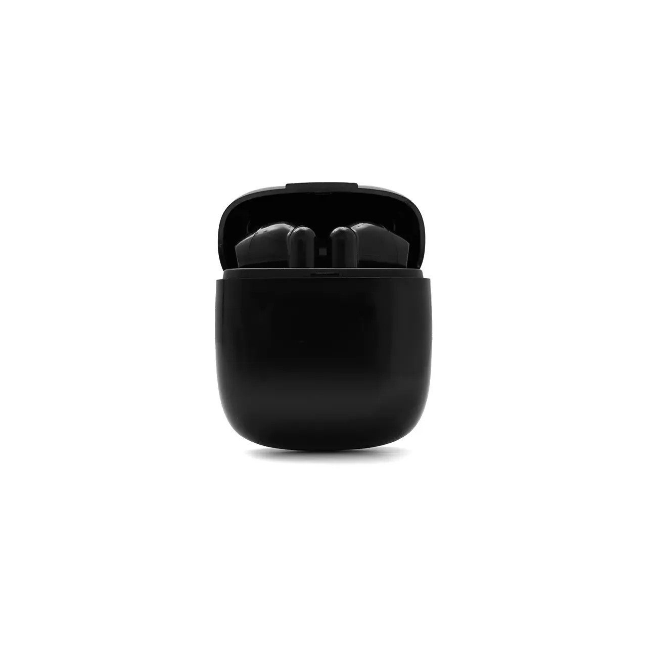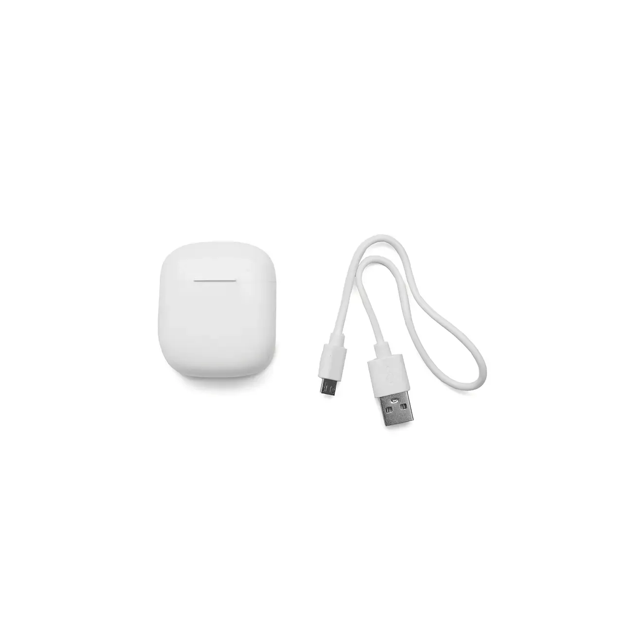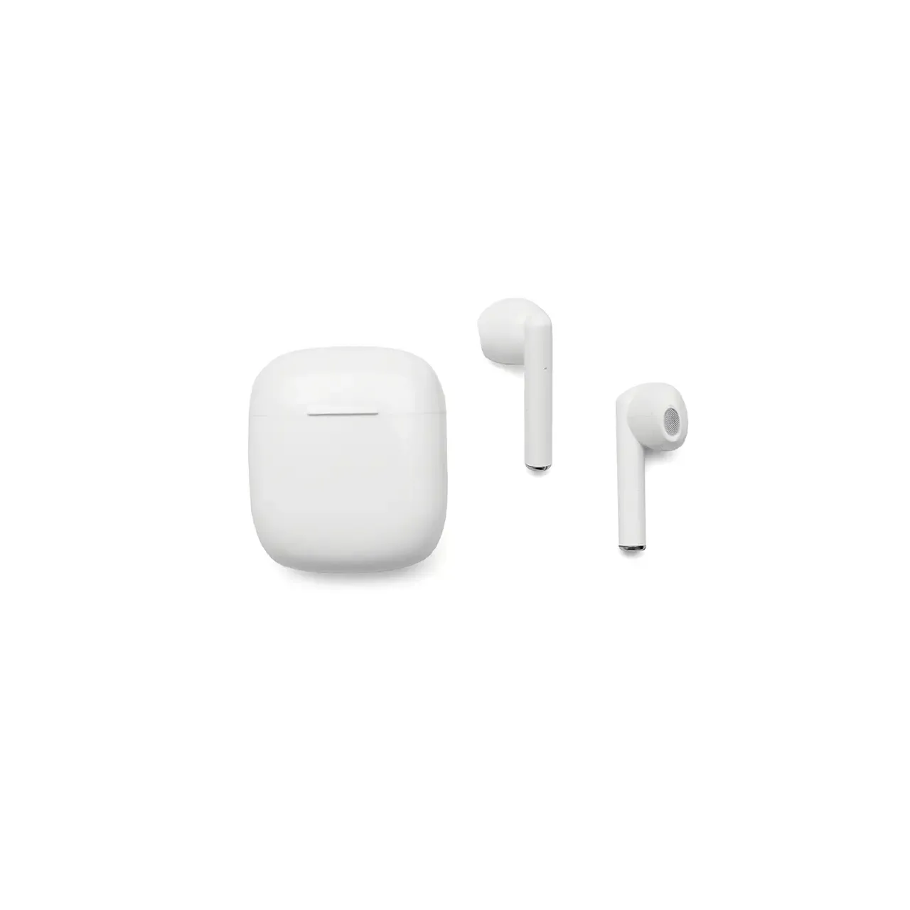 Auricular Bluetooth universal con micrófono incluido y estuche de carga. Está disponible en los colores blanco y negro e incluye un cable cargador USB. El estuche de carga cuenta con indicadores LED y botones de control táctil en ambos auriculares.