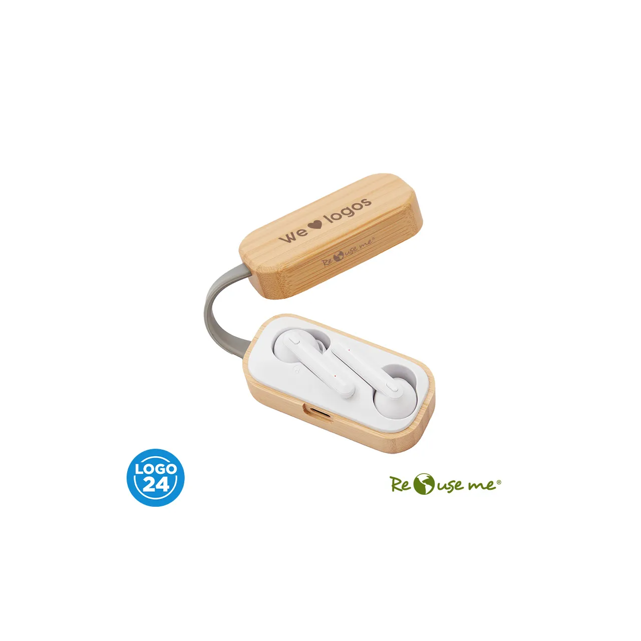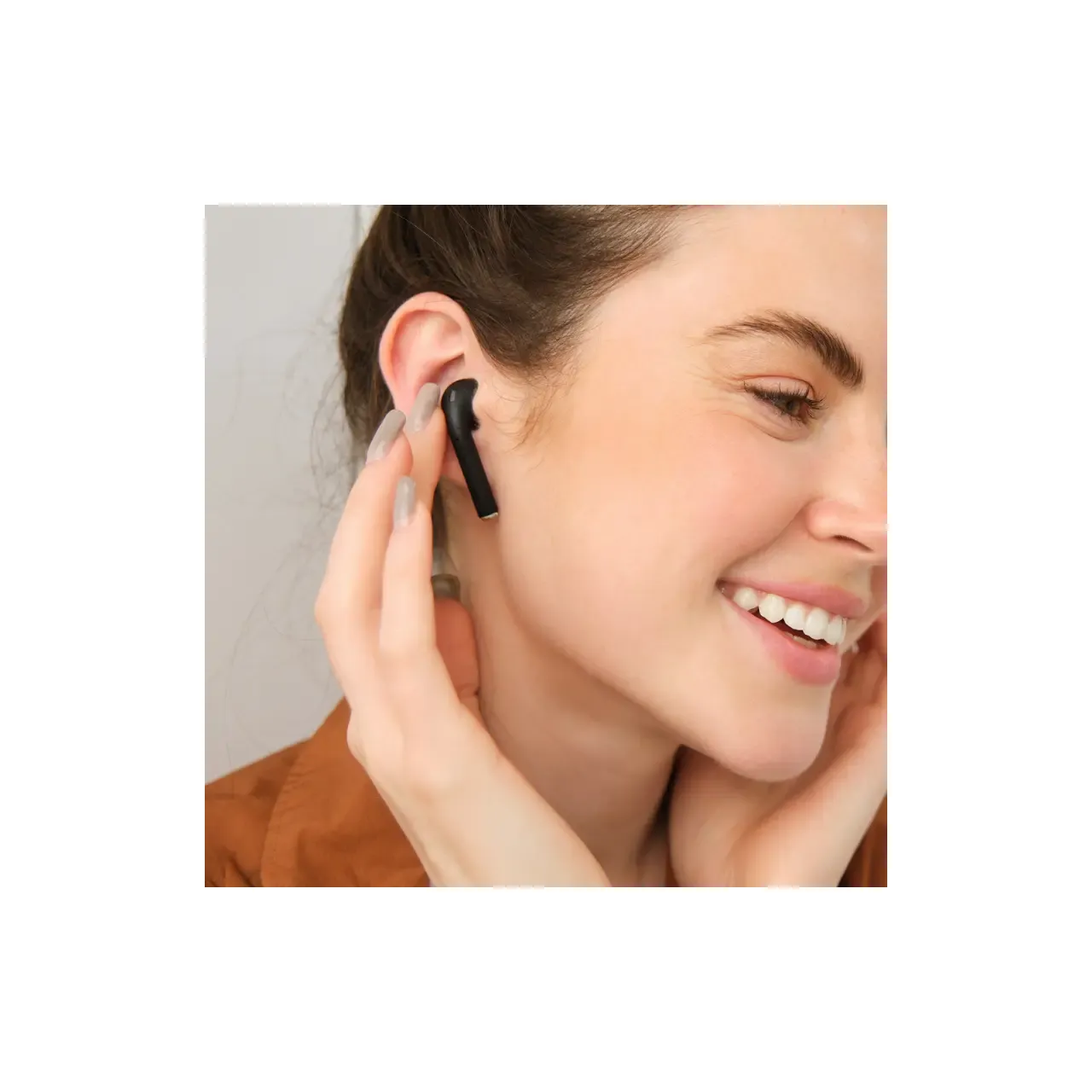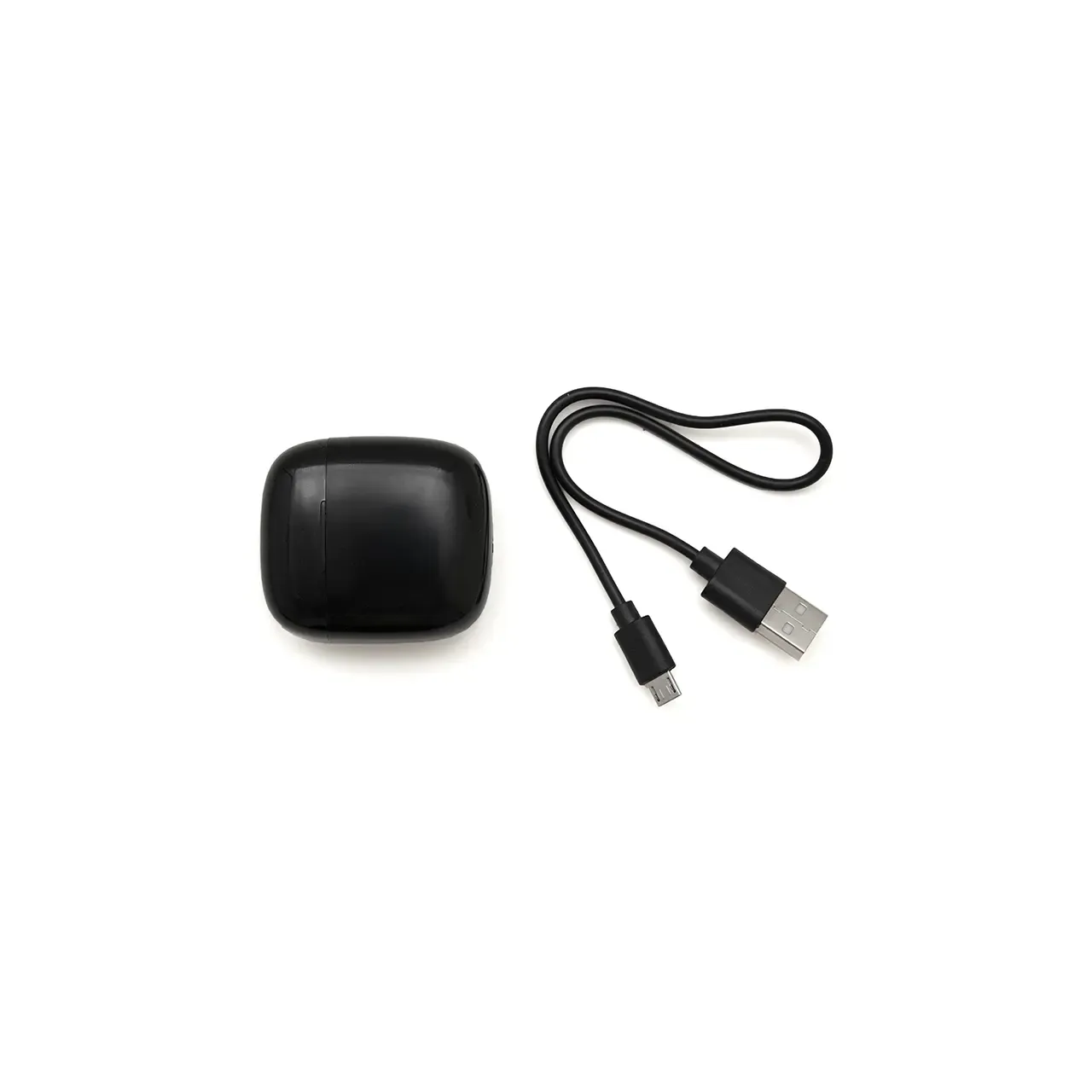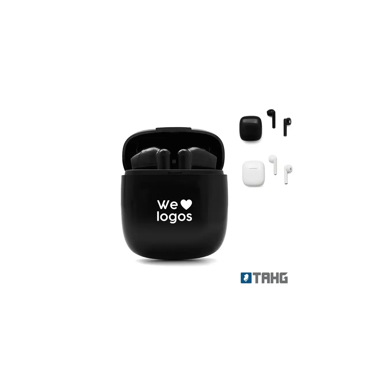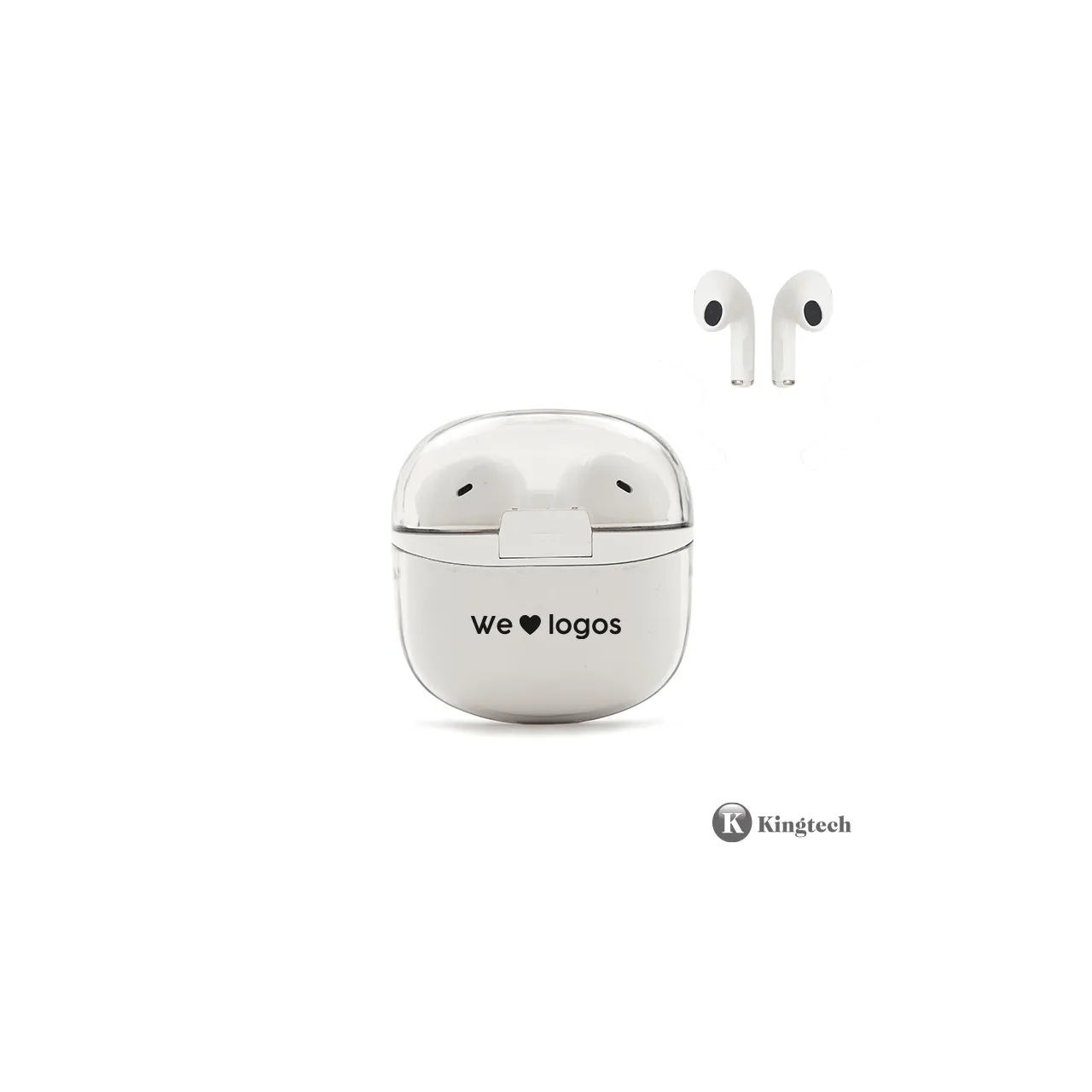 Auricular Bluetooth universal con micrófono incluido y estuche de carga. Está disponible en los colores blanco y negro e incluye un cable cargador USB. El estuche de carga cuenta con indicadores LED y botones de control táctil en ambos auriculares.