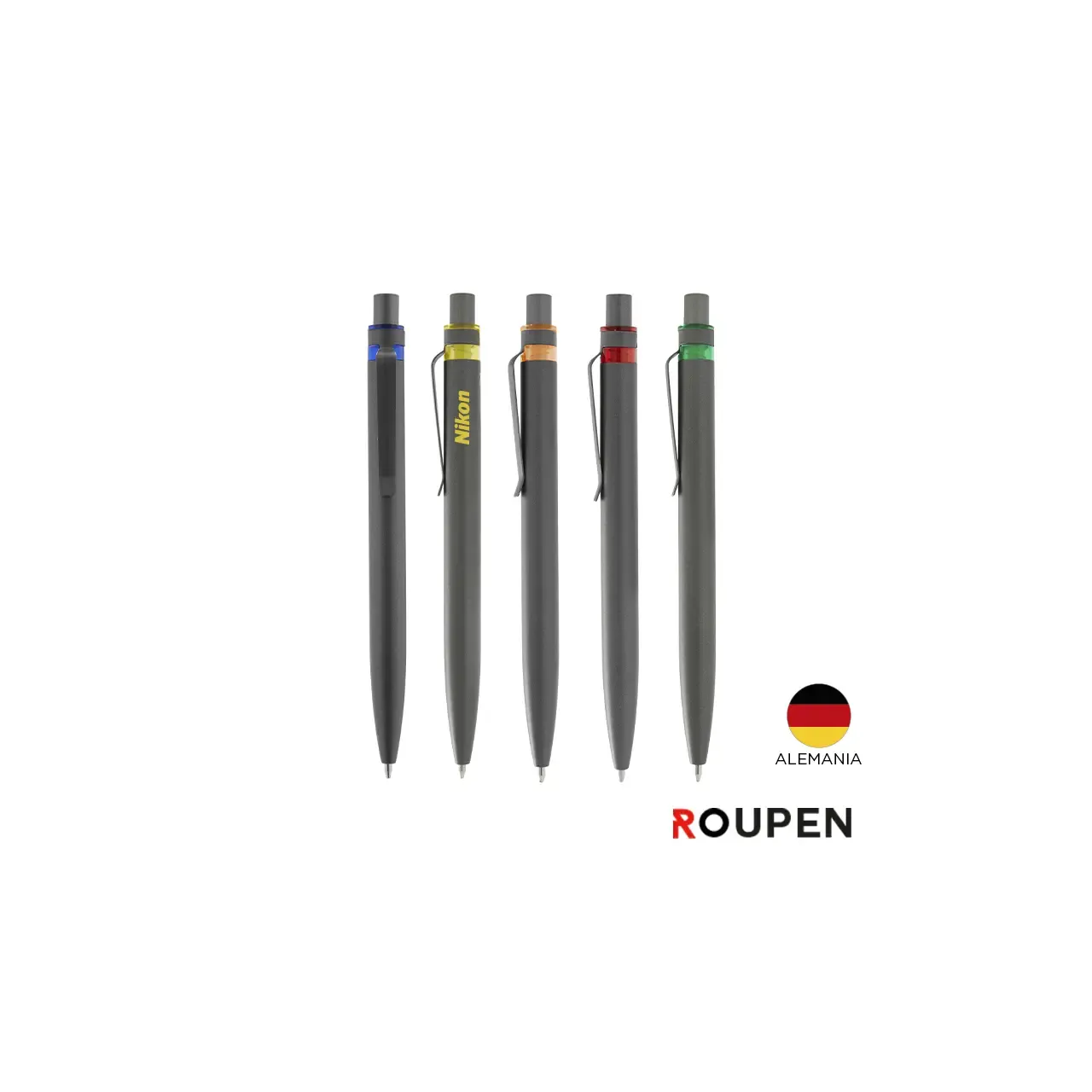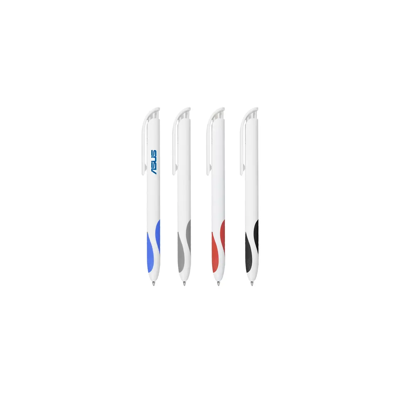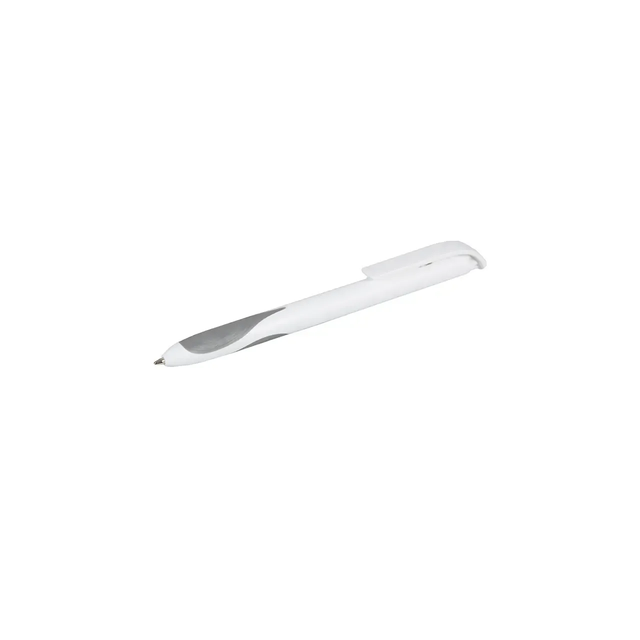 Bolígrafo plástico de cuerpo y clip en color blanco. Grip en TPR de color. Apertura con pulsador. Tinta Negra 500 m de longitud de escritura.
