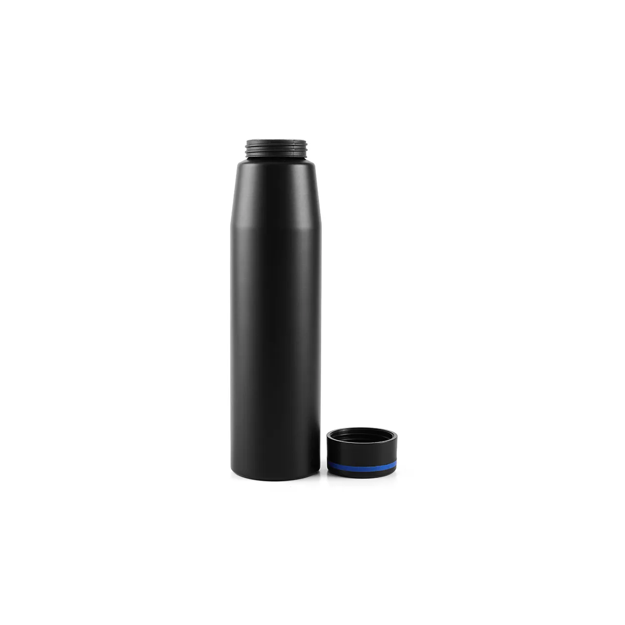 Botella de 700 ml fabricada en aluminio con tapa negra a rosca con banda de silicona de color gris, roja o azul. Ideal para tus actividades deportivas y al aire libre.