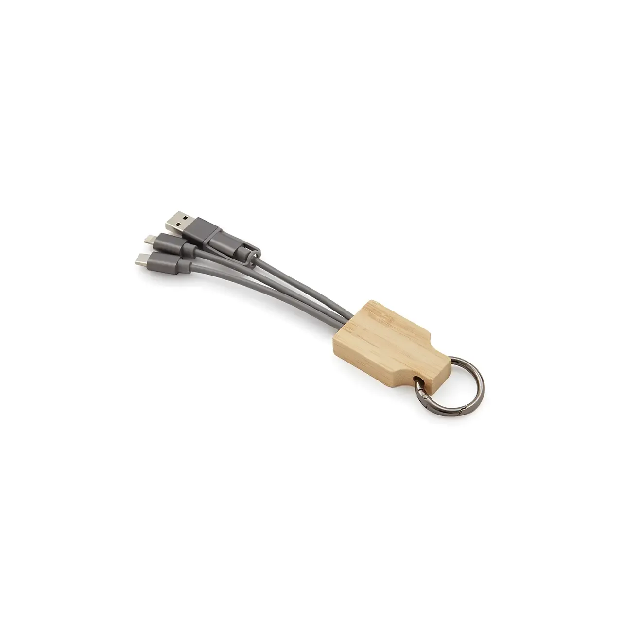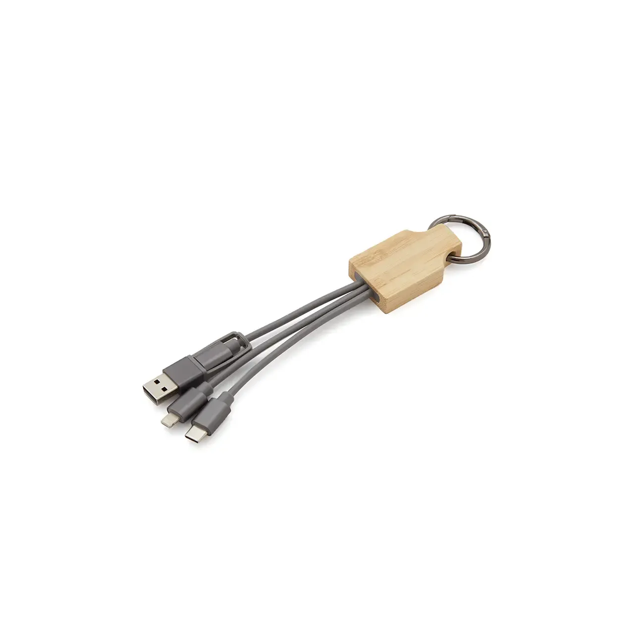 Es el accesorio perfecto para mantener tus dispositivos siempre cargados y listos para usar. Cuenta con un accesorio rectangular de bamboo de donde salen los cables y un gancho de aluminio en tono con los cables.