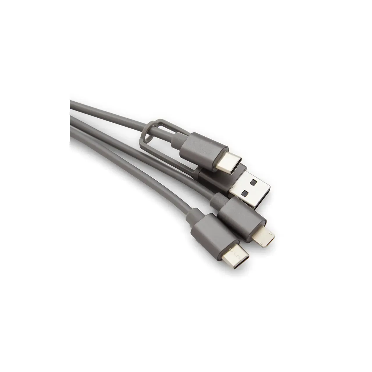 Cable 3 en 1 color gris, con una longitud de 12 cm. Incluye cable de entrada TIPO C con adaptador USB A y 2 cables de salida MICRO B / LIGHTING, lo que te permite cargar dispositivos con diferentes tipos de entradas.