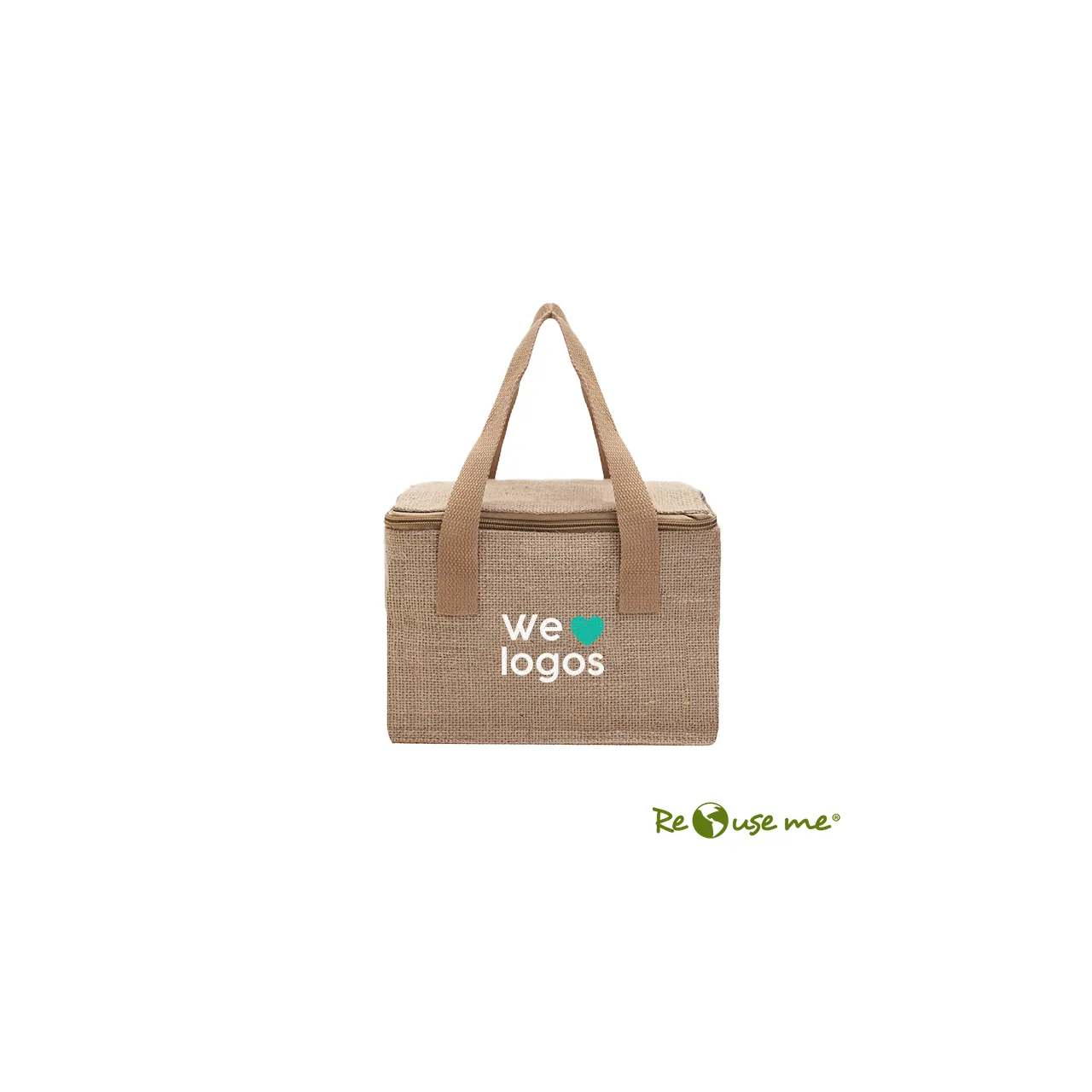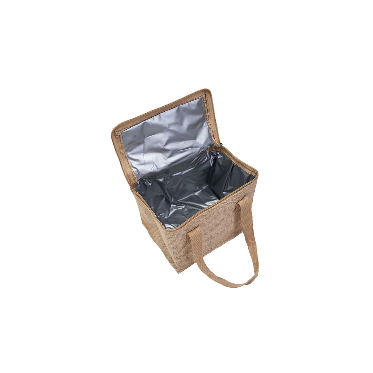Cooler con exterior de Yute e interior térmico confeccionado en PEVA. Debido a la naturaleza rústica del material, el producto puede presentar imperfecciones.