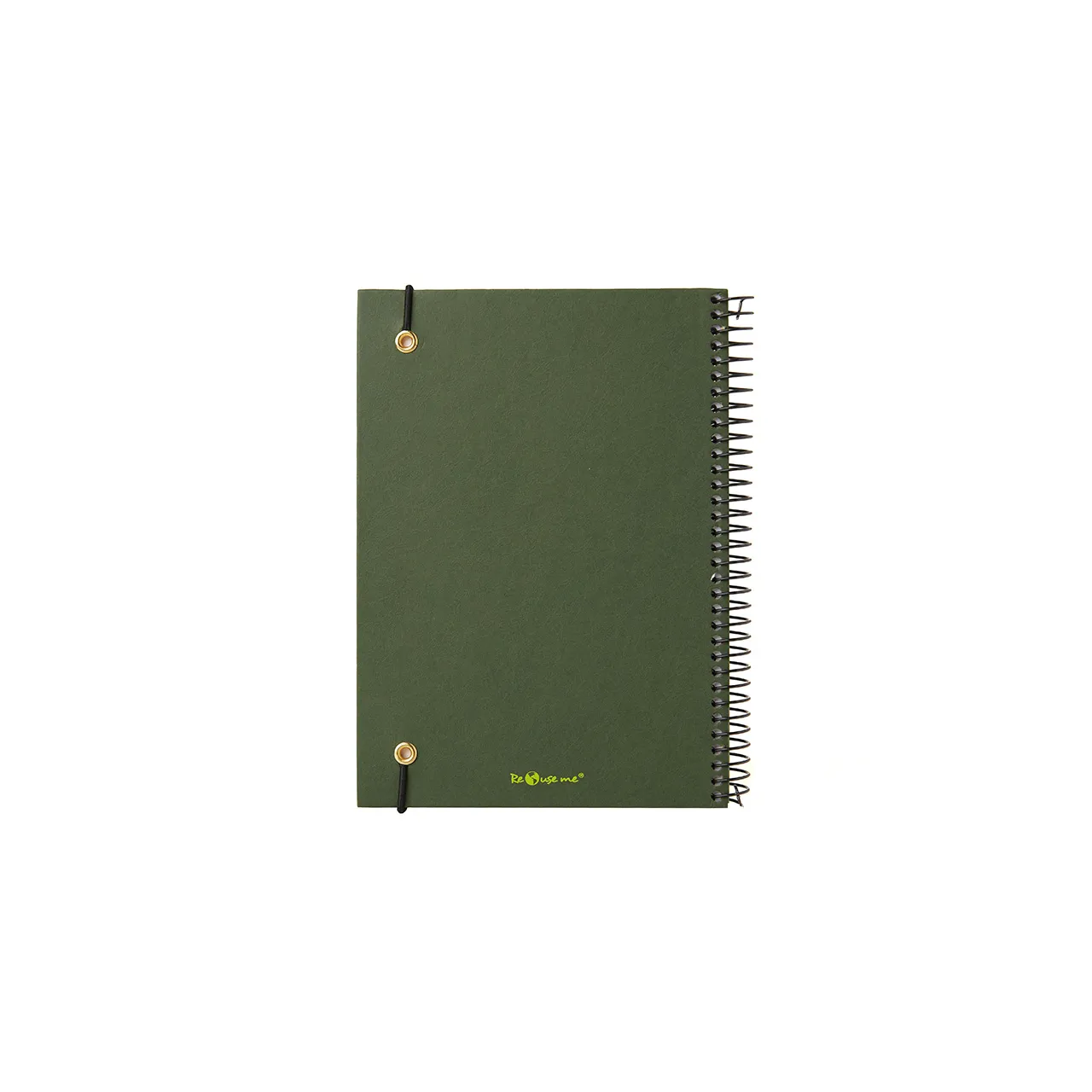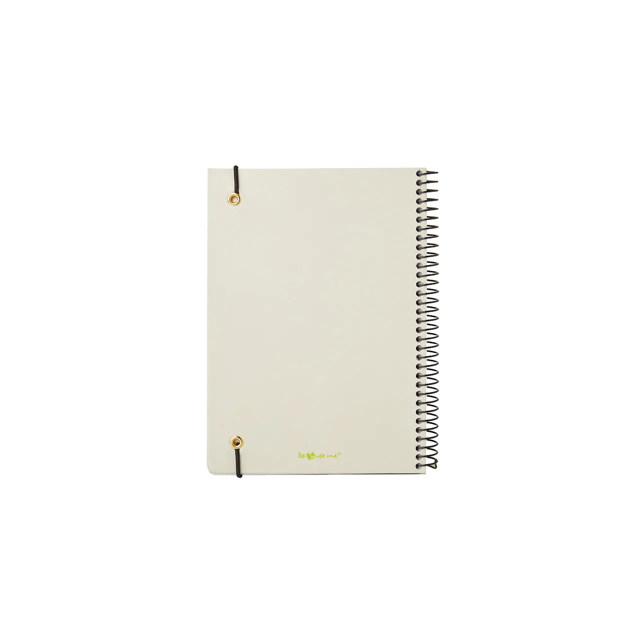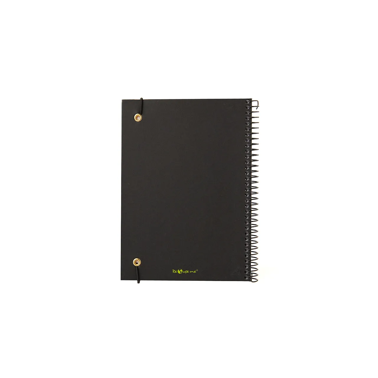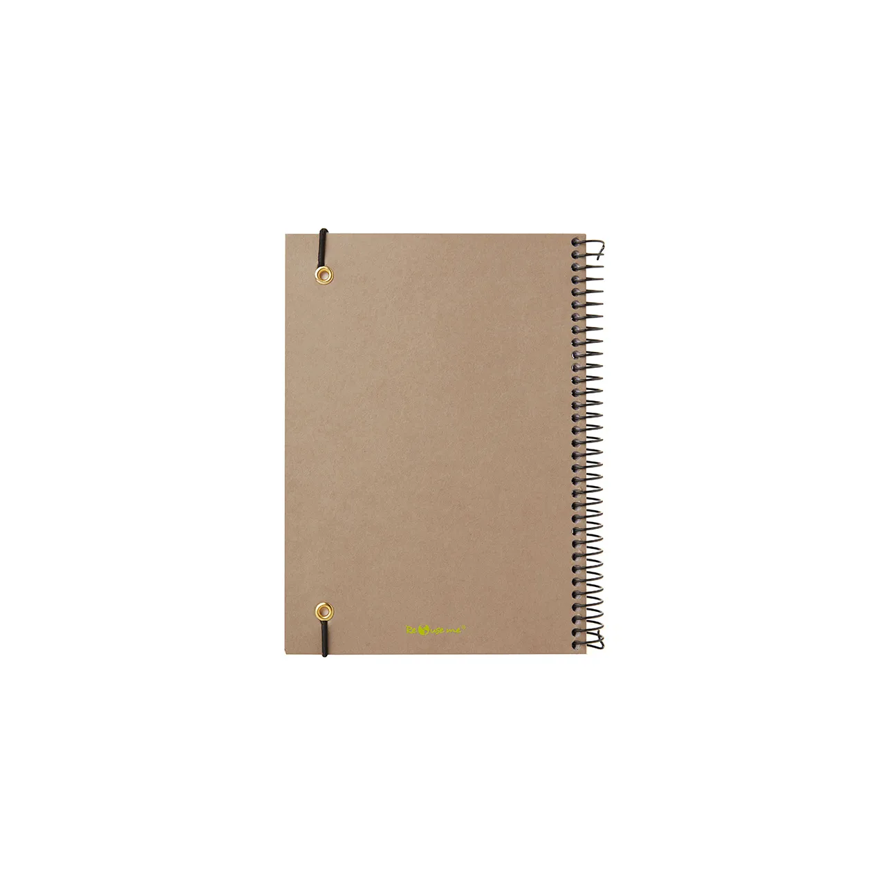 Cuaderno anillado con tapa confeccionado con papel Kraft y 100 hojas lisas de 170 gr. Cuenta con un cierre elástico. Medidas : 14,8 x 21,2 cm. Se presenta protegido en bolsa. ReUseMe.