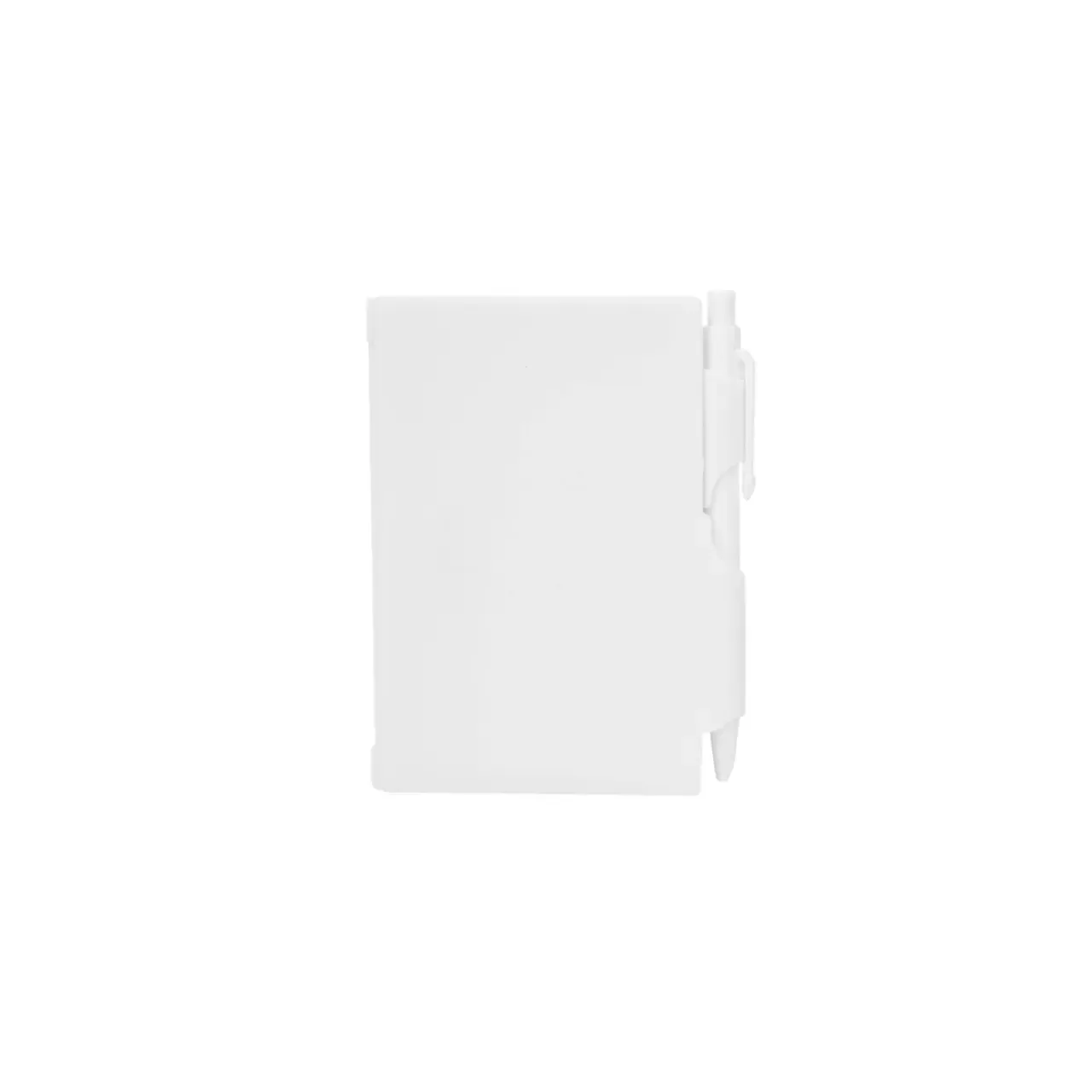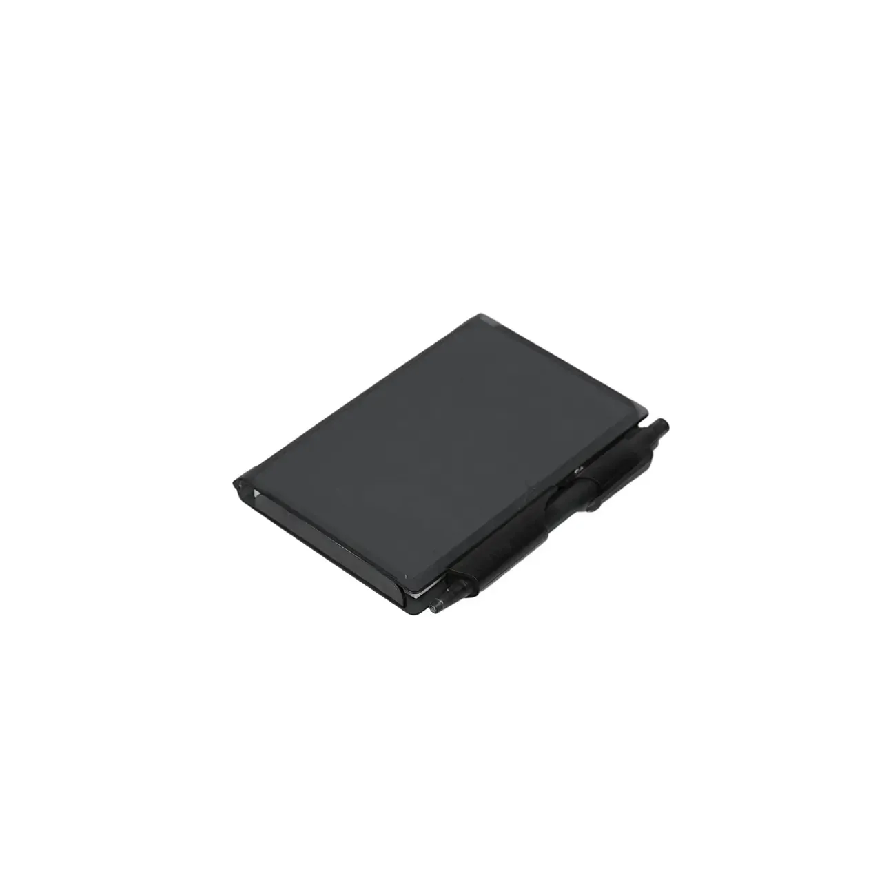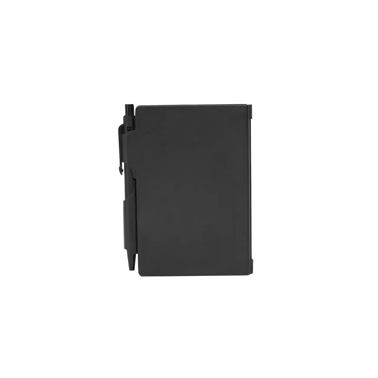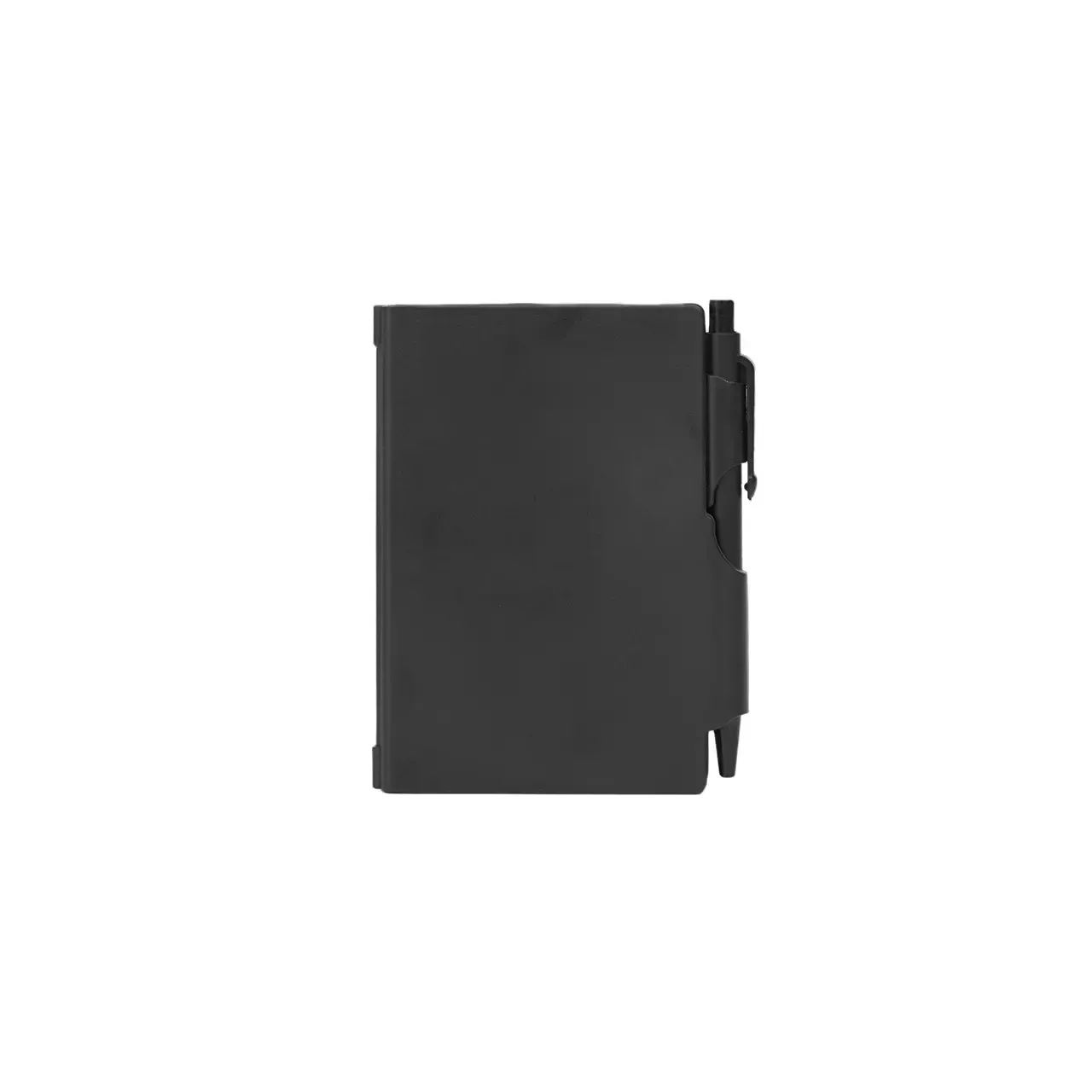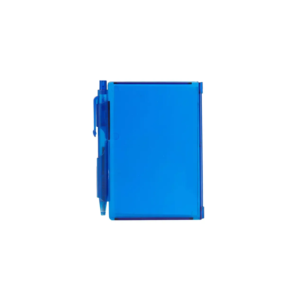 Cuaderno de bolsillo, con tapa dura plástica de PS y porta bolígrafo (Tinta azul). 80 hojas lisas. Incluye bolígrafo. Medidas: 10,4 x 7,8 cm. Tahg
