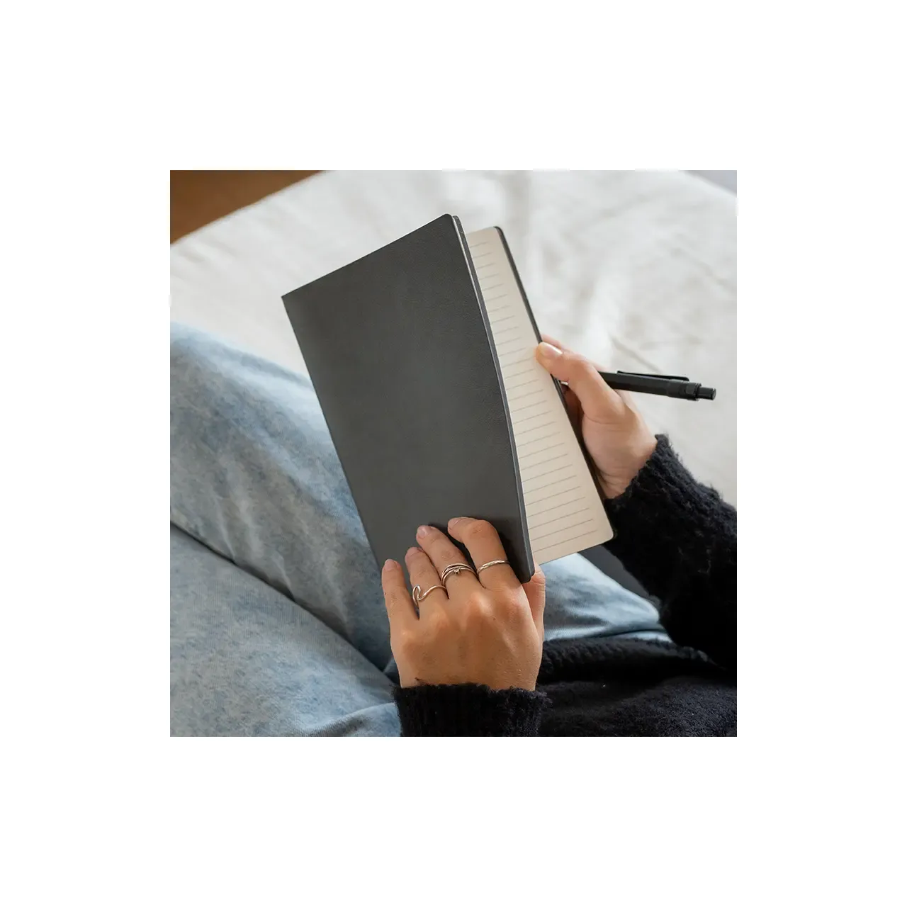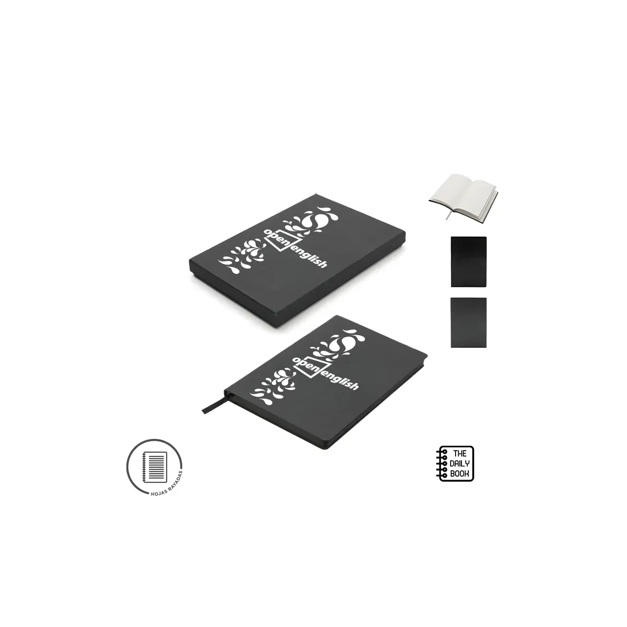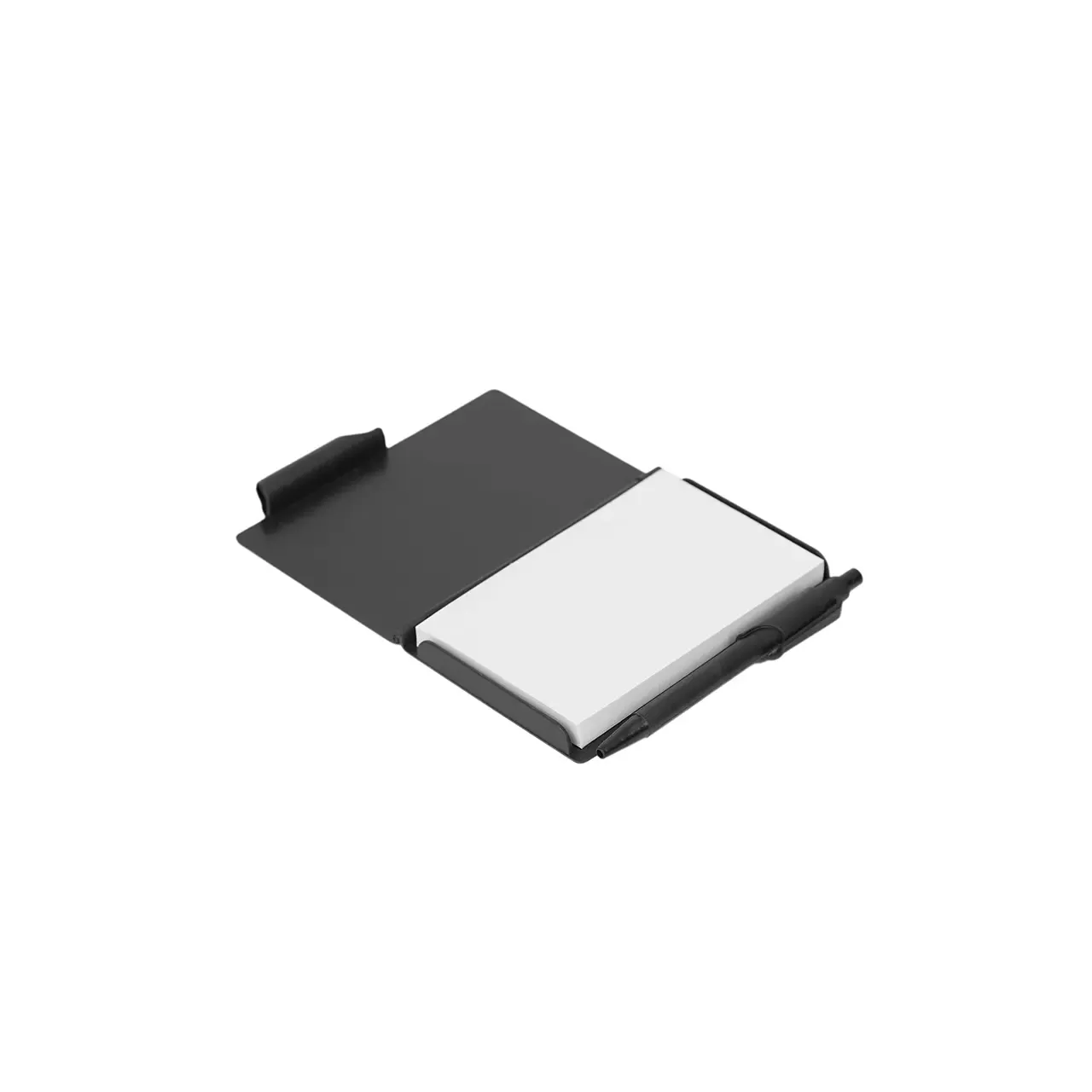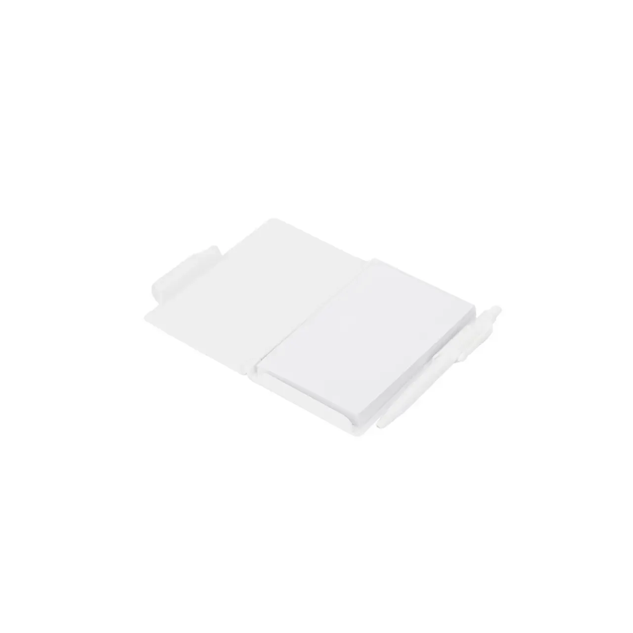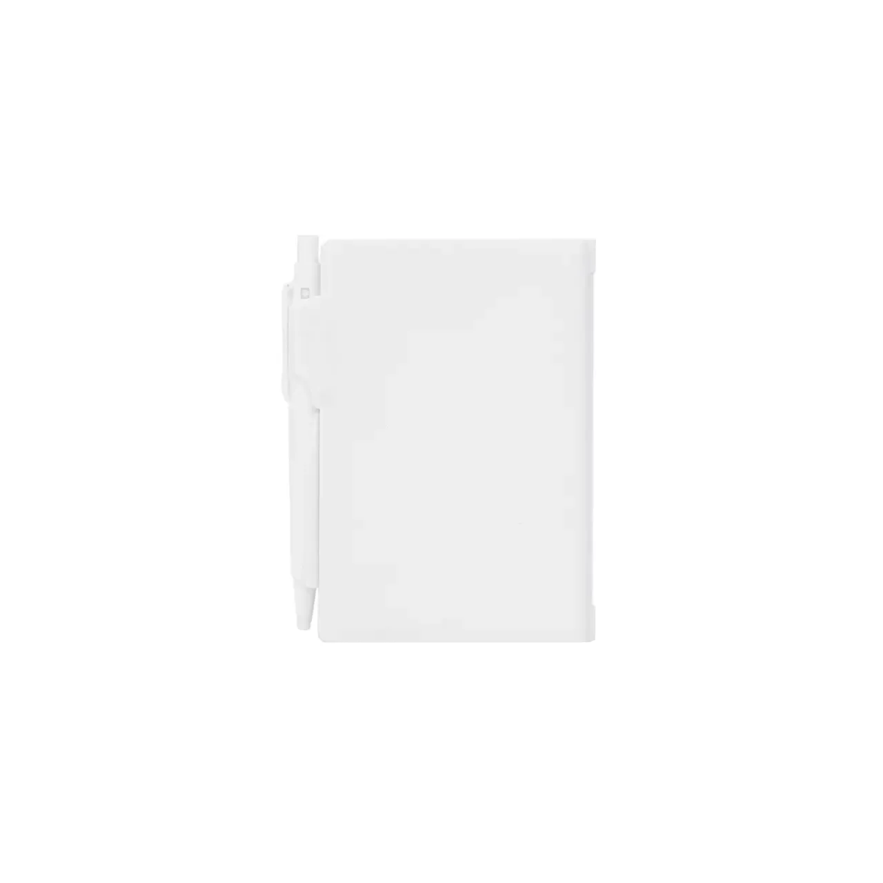 Cuaderno de bolsillo, con tapa dura plástica de PS y porta bolígrafo (Tinta azul). 80 hojas lisas. Incluye bolígrafo. Medidas: 10,4 x 7,8 cm. Tahg