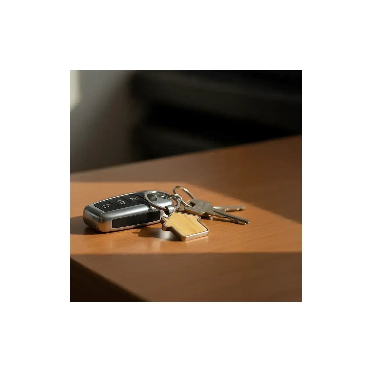 Llavero metálico con silueta de casa y bambú. Fabricado en aleación de zinc y bambú en tono natural. Cuenta con anilla resistente y diseño de casa, ideal para branding. Es ideal para inmobiliarias, constructoras, promociones y obsequios corporativos.