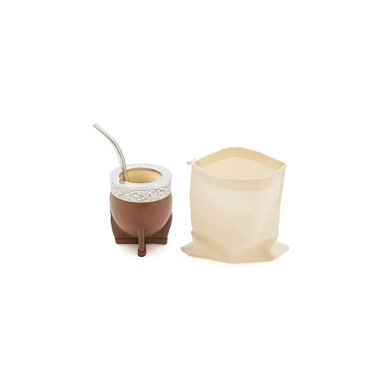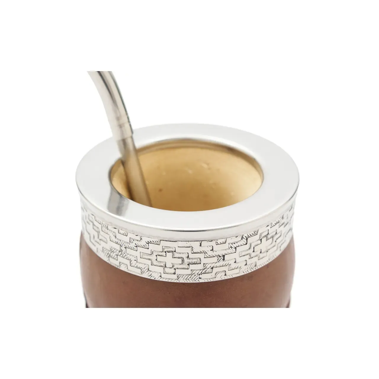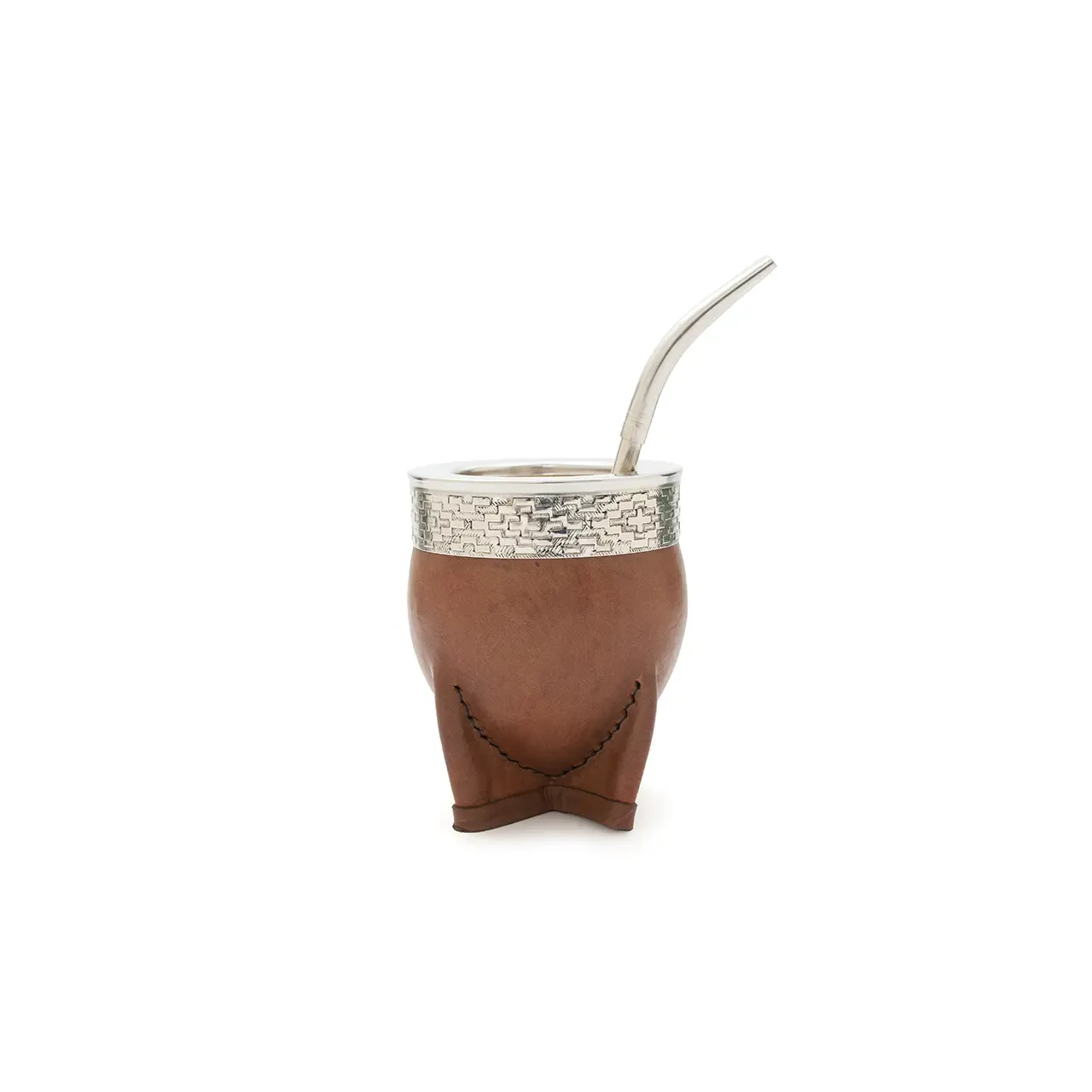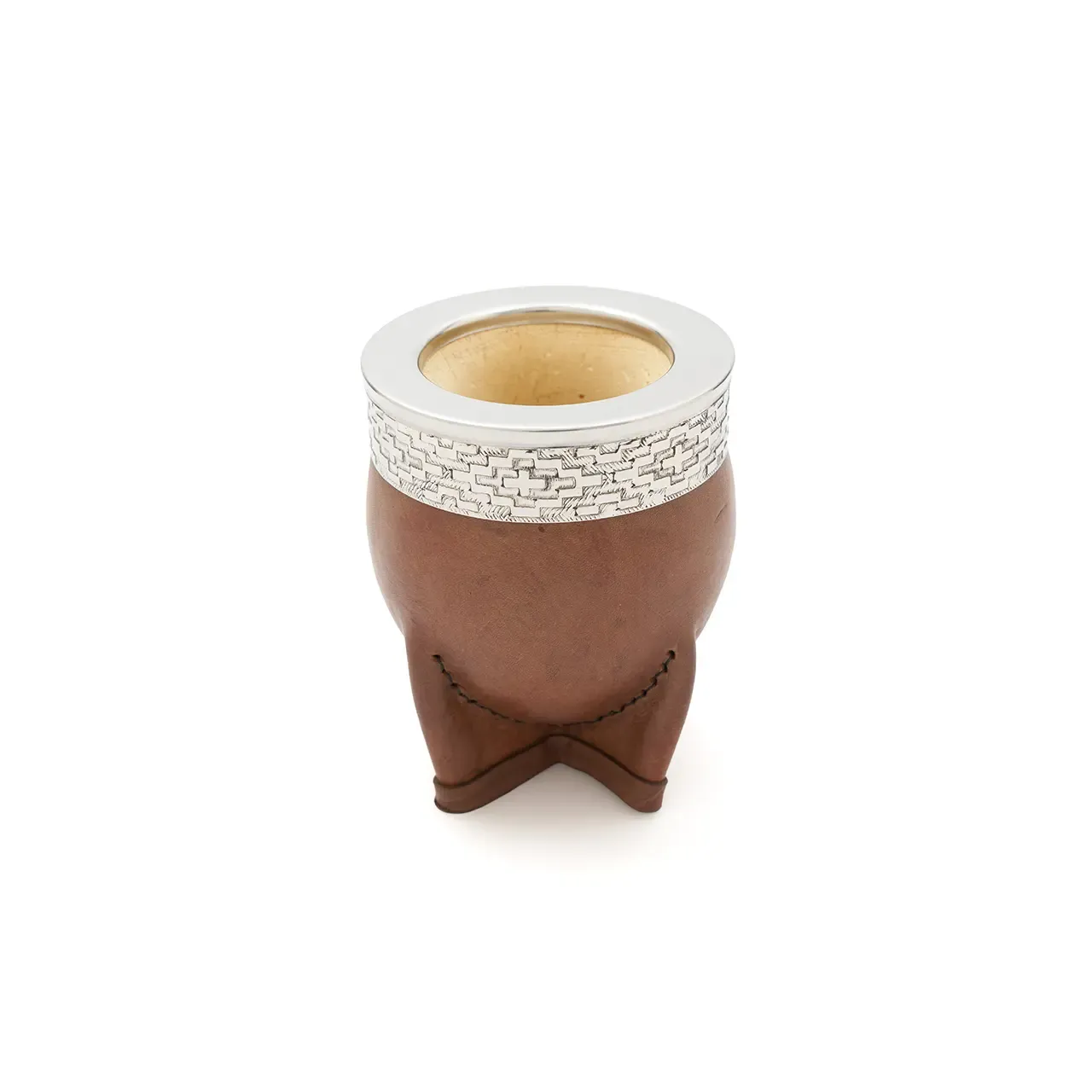 Mate de calabaza tipo imperial modelado en cuero vaqueta vacuno, cuenta con virola superior de acero inoxidable pulido espejo con un diseño de guarda pampa grabado. Ideal para uso diario, regalos corporativos o como producto destacado en tiendas especializadas. Incluye bombilla pico de loro y una bolsa de algodón de 20 x 20cm.