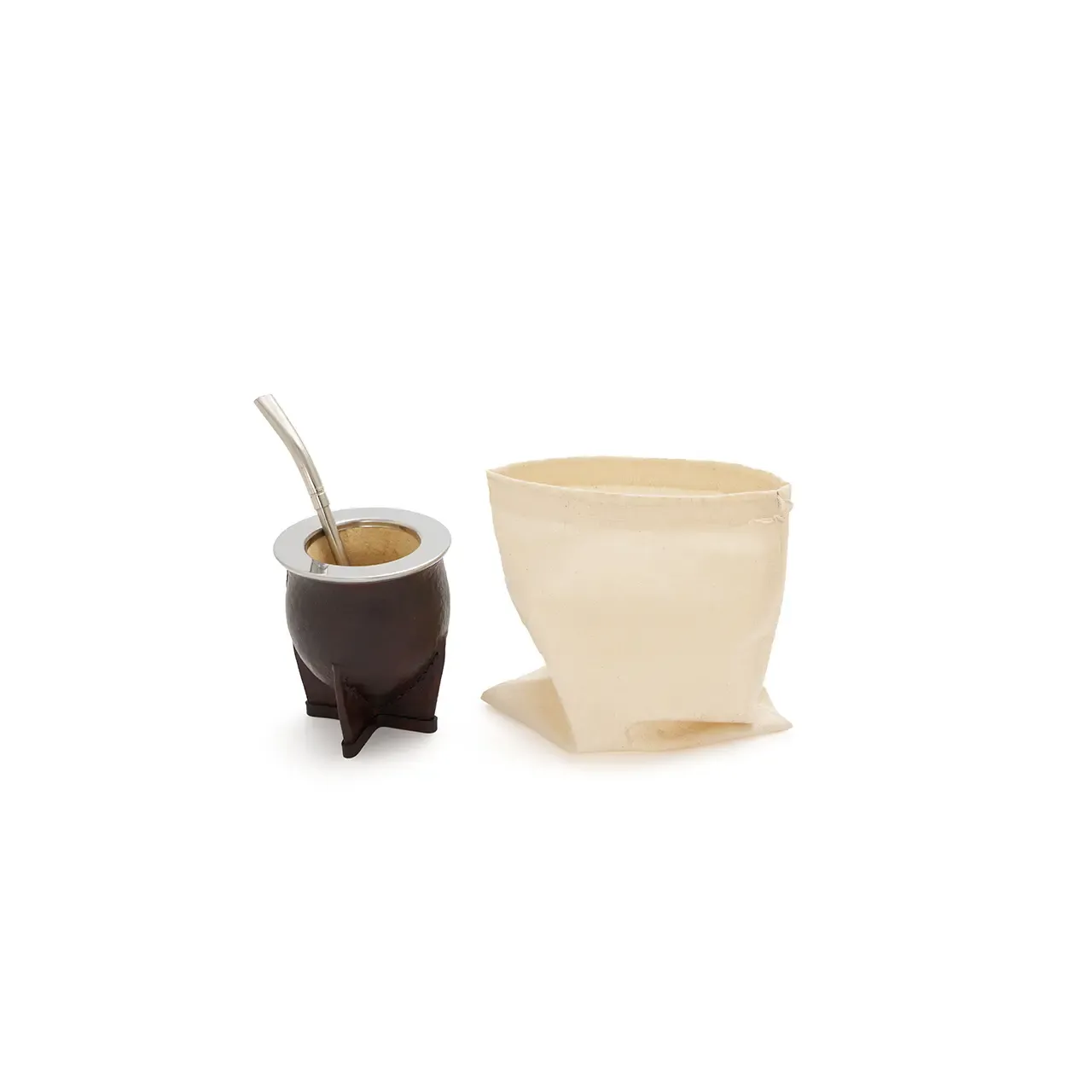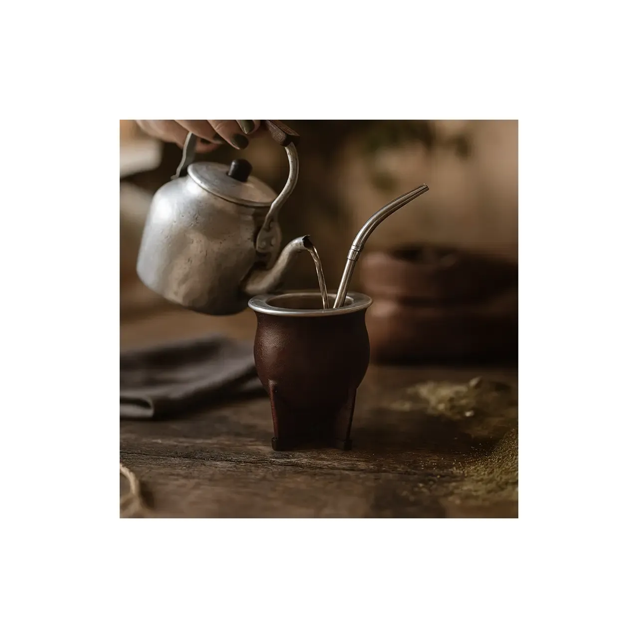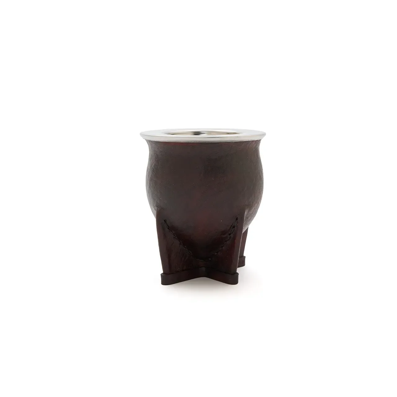Mate de calabaza tipo camionero moldeado en cuero vacuno con aro de acero inoxidable pulido espejo. Es ideal para uso diario, campañas institucionales o packs promocionales. Incluye bombilla pico de loro y una bolsa de algodón de 20 x 20cm.