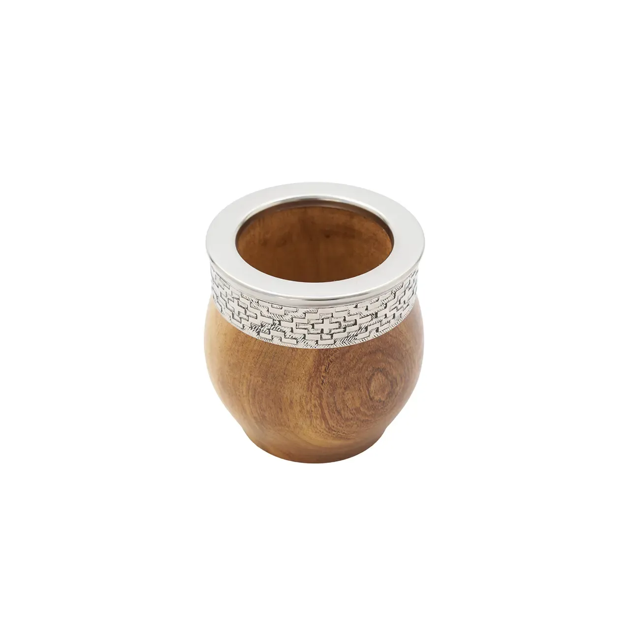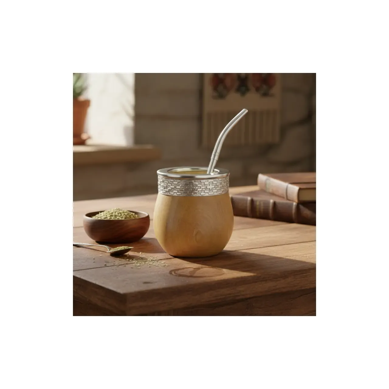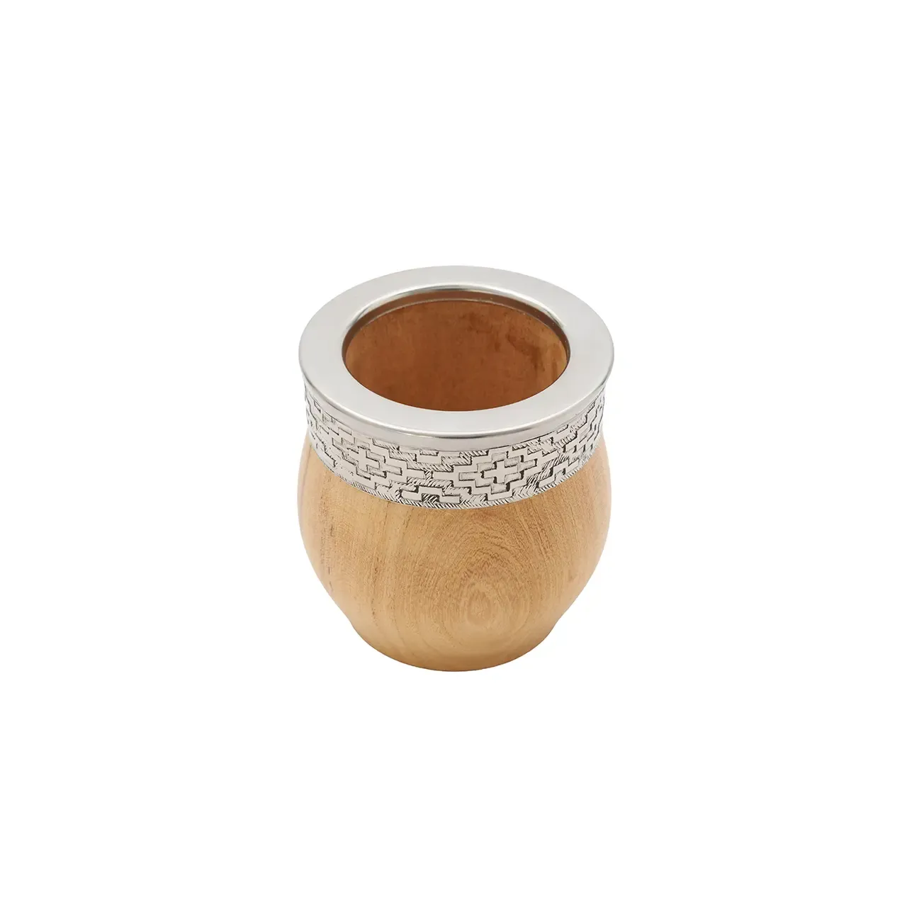 Mate de algarrobo seleccionado pulido con virola imperial de acero inoxidable guarda pampa. Cada pieza puede presentar vetas y nudos que le otorgan un carácter único. Es ideal para quienes desean un mate resistente, elegante y cómodo para el uso diario o para regalar.
