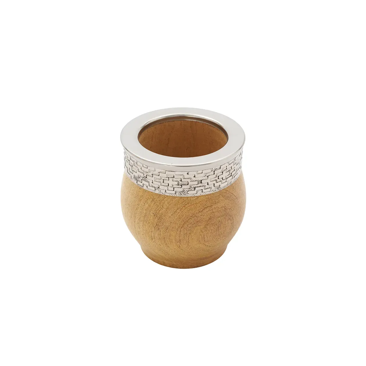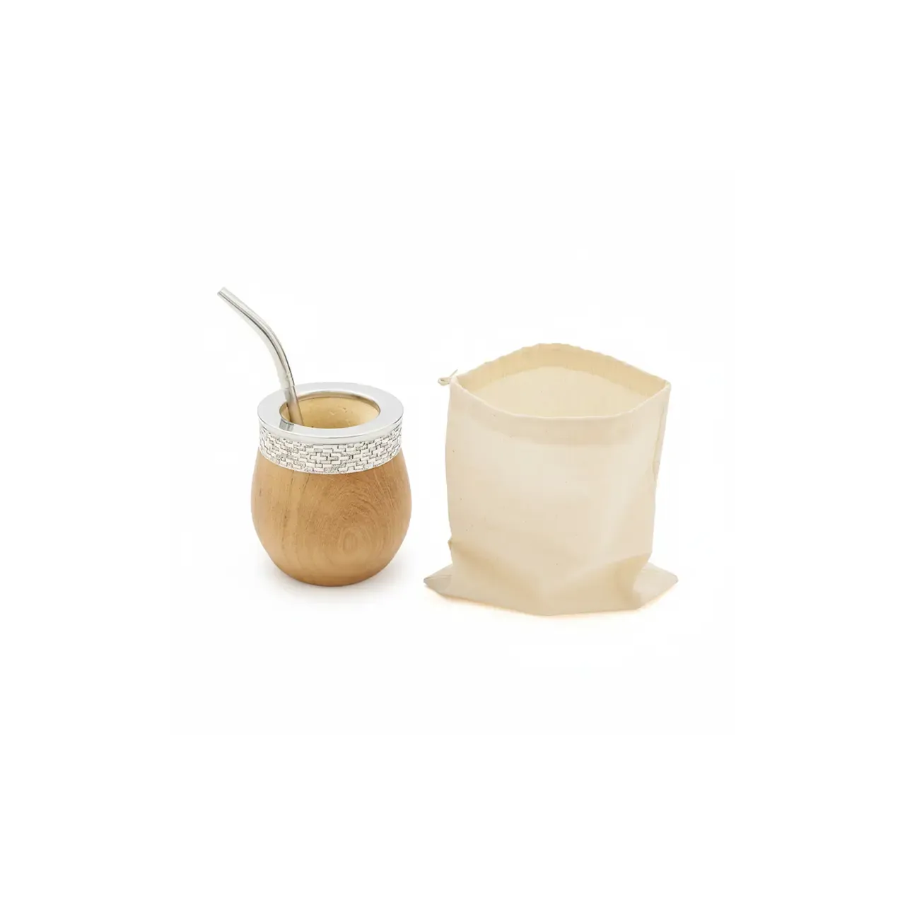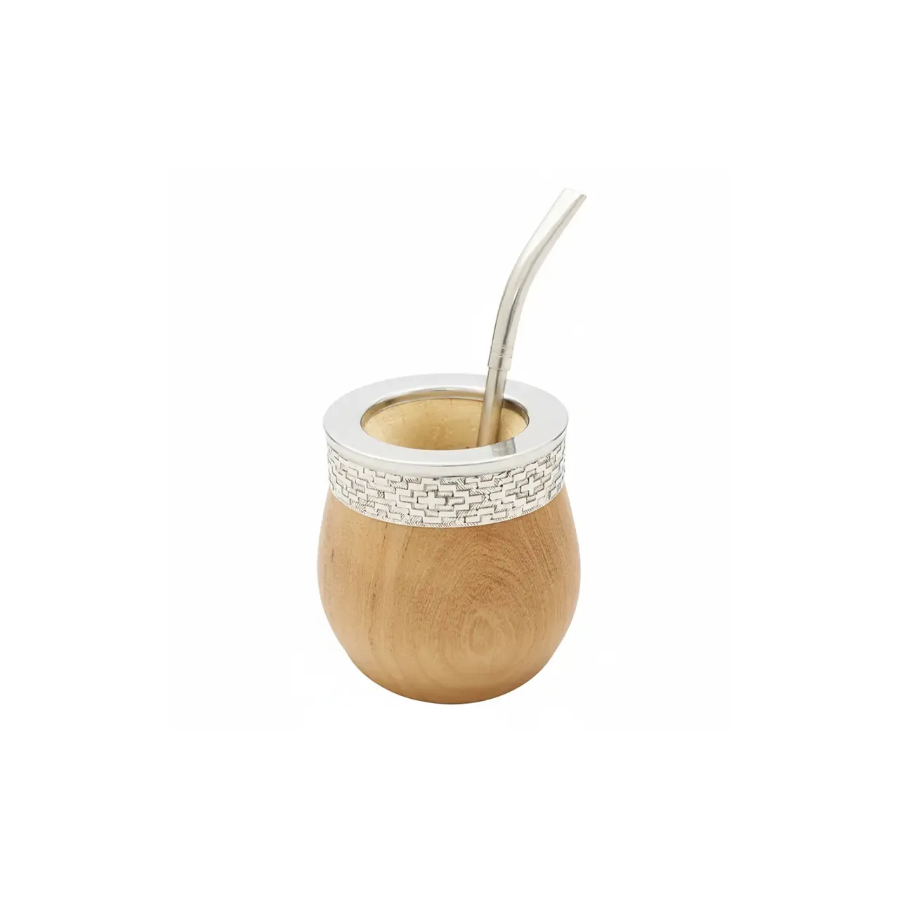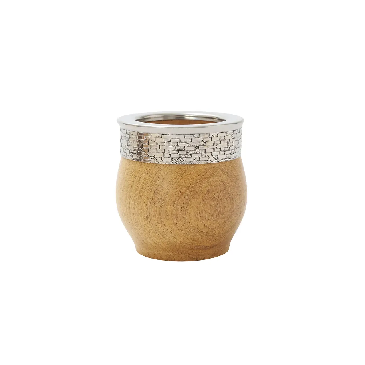 Mate de algarrobo seleccionado pulido con virola imperial de acero inoxidable guarda pampa. Cada pieza puede presentar vetas y nudos que le otorgan un carácter único. Es ideal para quienes desean un mate resistente, elegante y cómodo para el uso diario o para regalar.