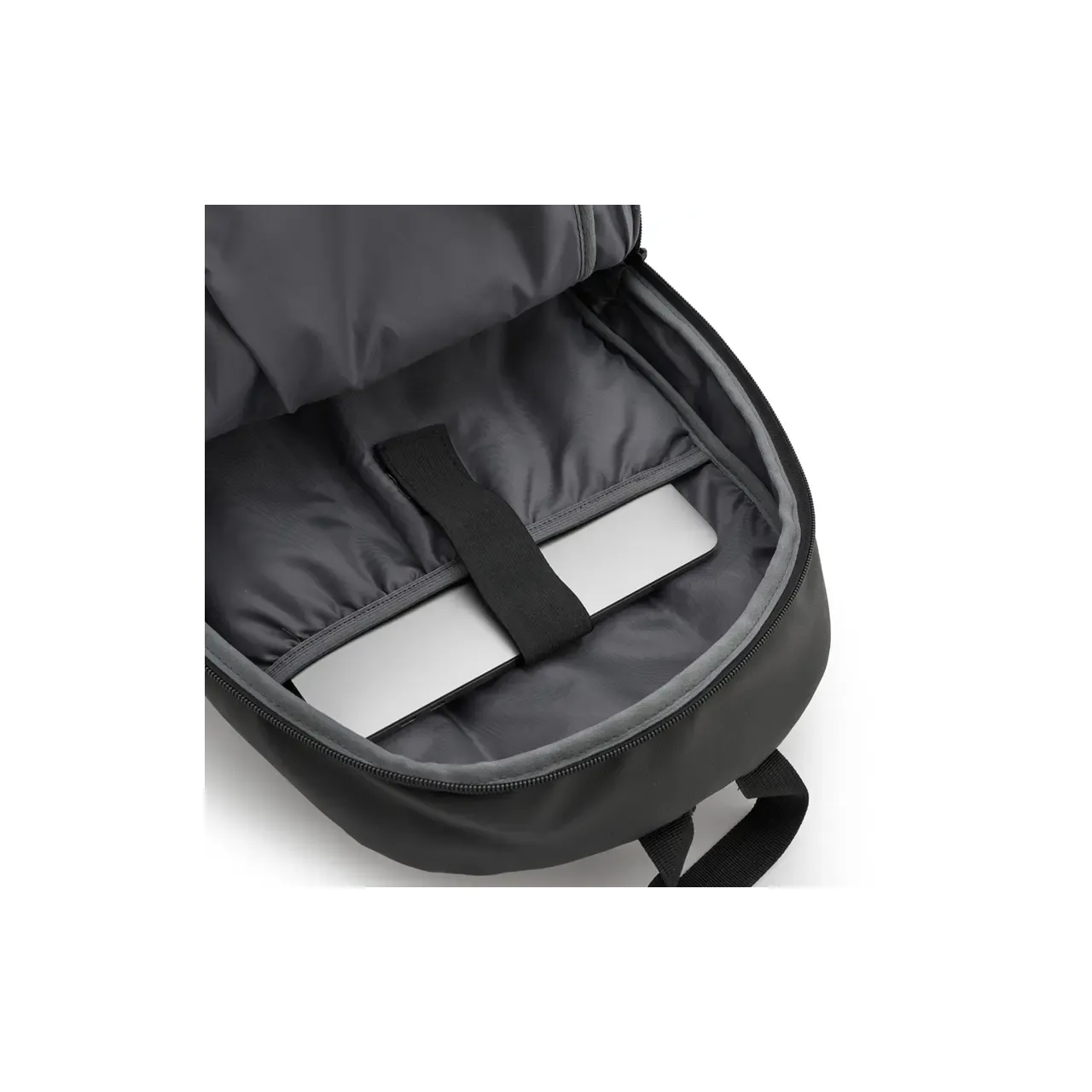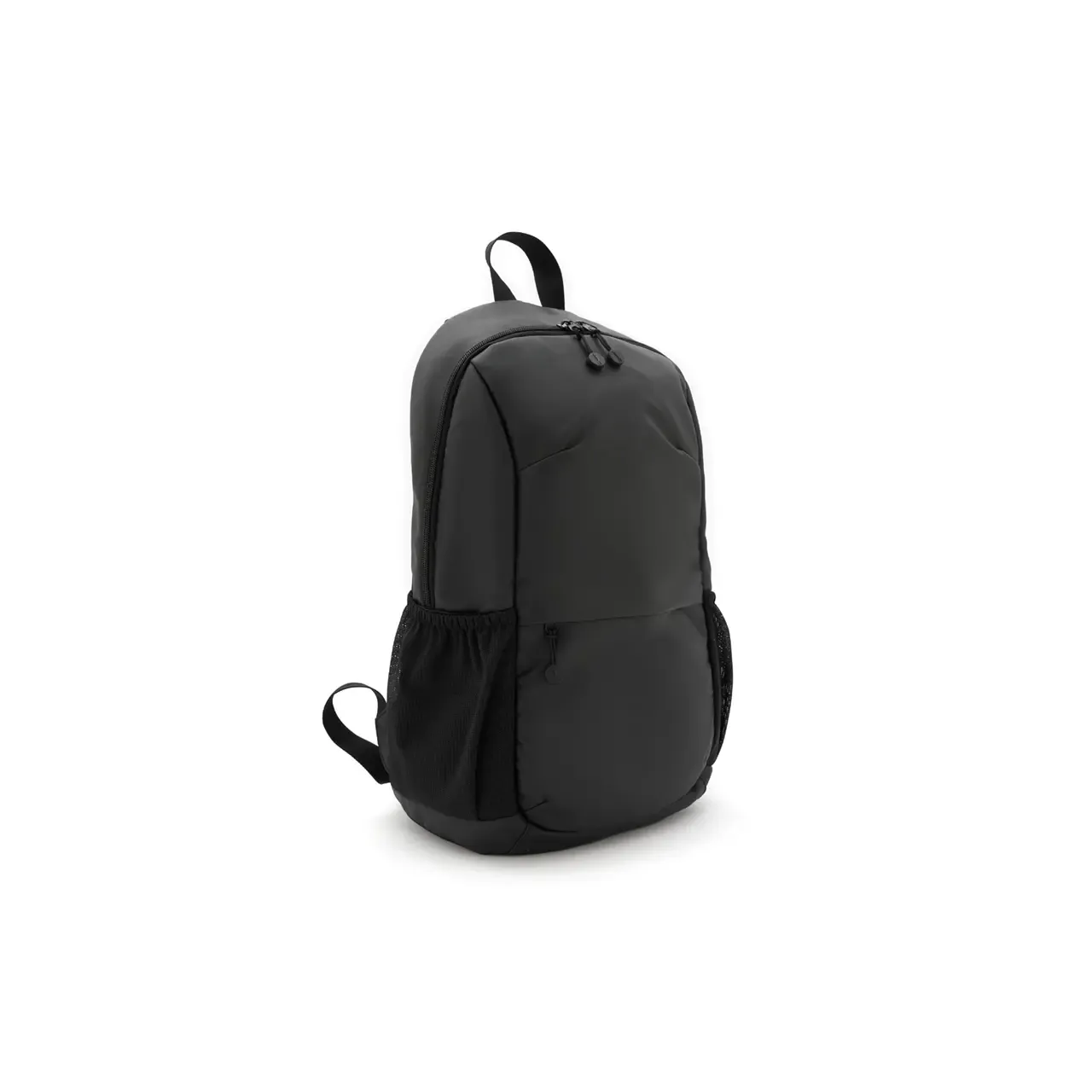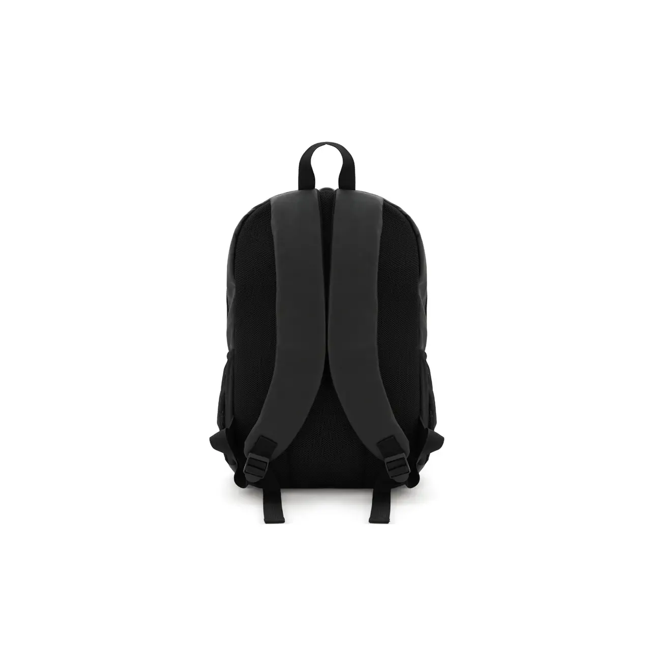Mochila de color negro fabricada en material PU con espuma de PE y forro completo. Cuenta con un bolsillo frontal, compartimento interno para computadora con correa elástica y velcro, y dos bolsillos laterales de malla. Ideal para quienes necesitan una mochila funcional y resistente para transportar su computadora y pertenencias en sus actividades diarias.