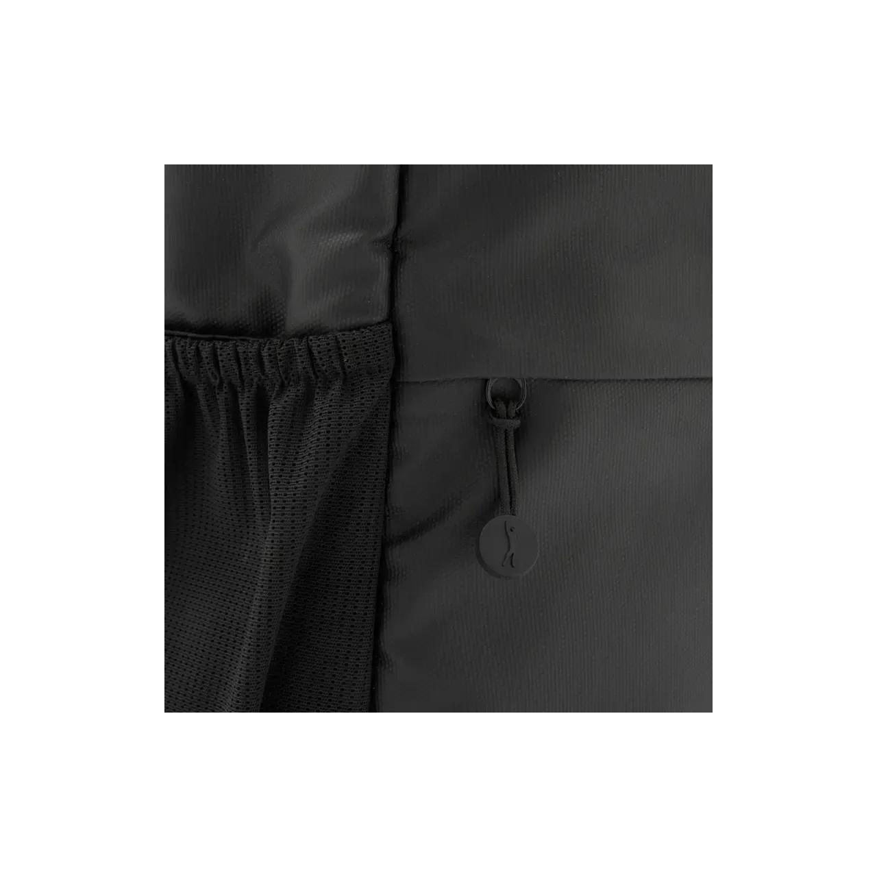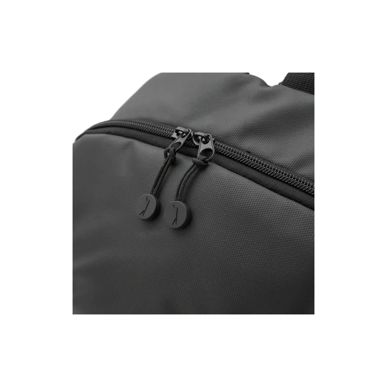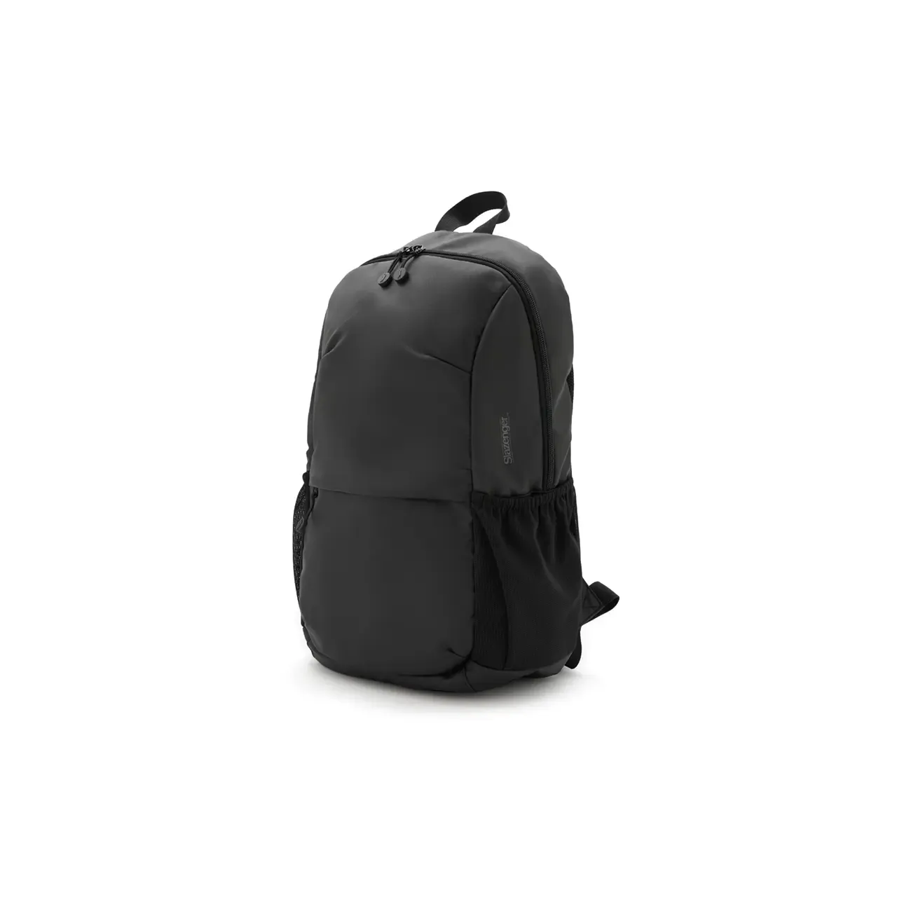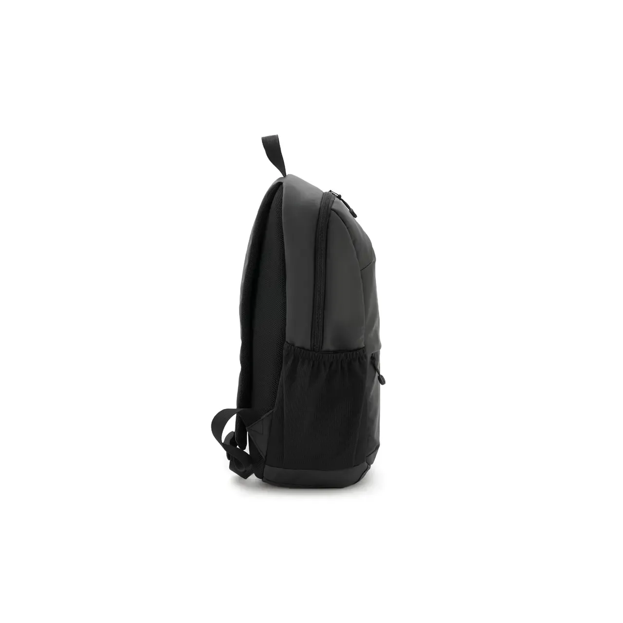 Mochila de color negro fabricada en material PU con espuma de PE y forro completo. Cuenta con un bolsillo frontal, compartimento interno para computadora con correa elástica y velcro, y dos bolsillos laterales de malla. Ideal para quienes necesitan una mochila funcional y resistente para transportar su computadora y pertenencias en sus actividades diarias.