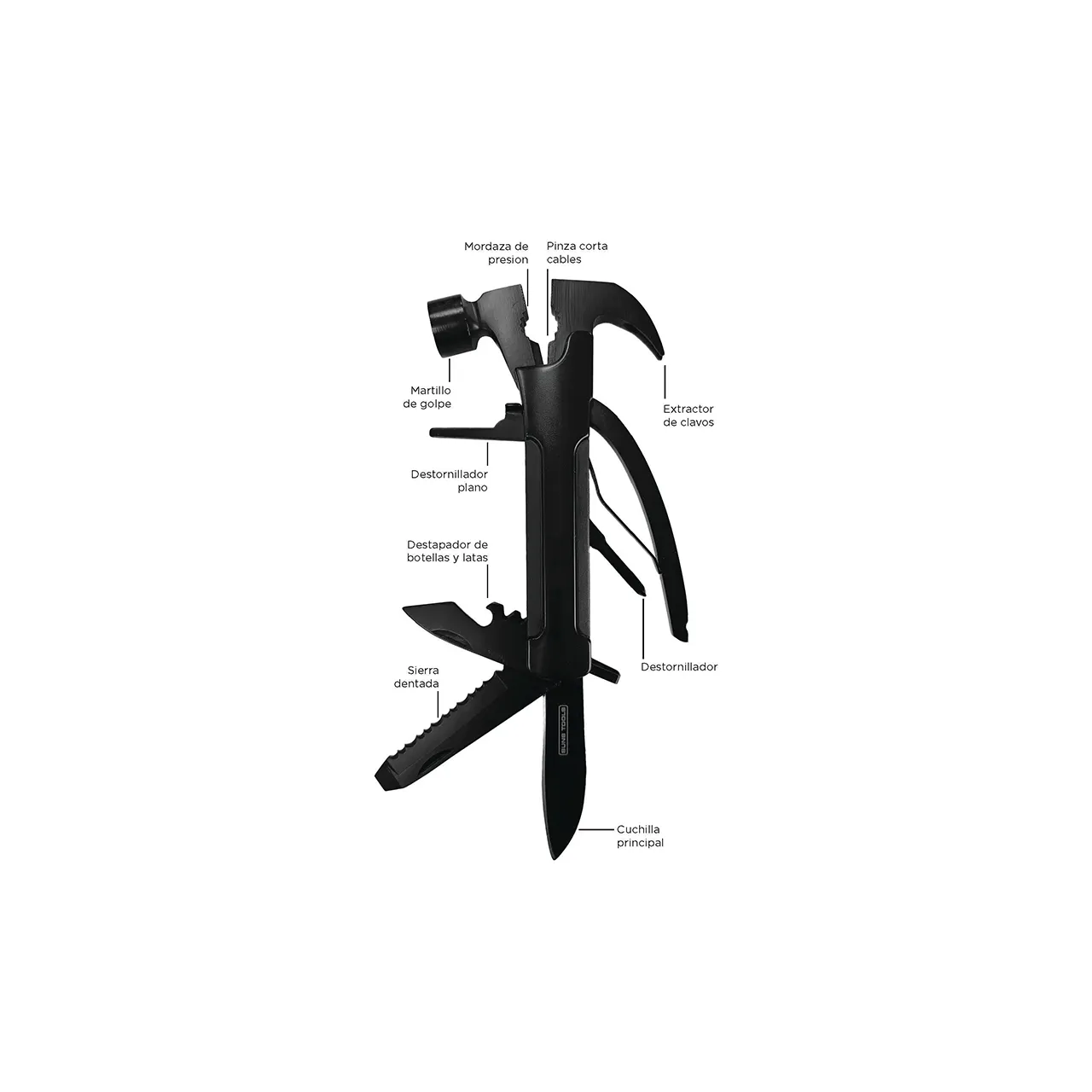 Martillo multifuncional con elementos de acero inoxidable y aluminio de 6 funciones. Incluye estuche negro. Medidas:19,3 x 20,5 x 3,8 cm. Suns Tools.