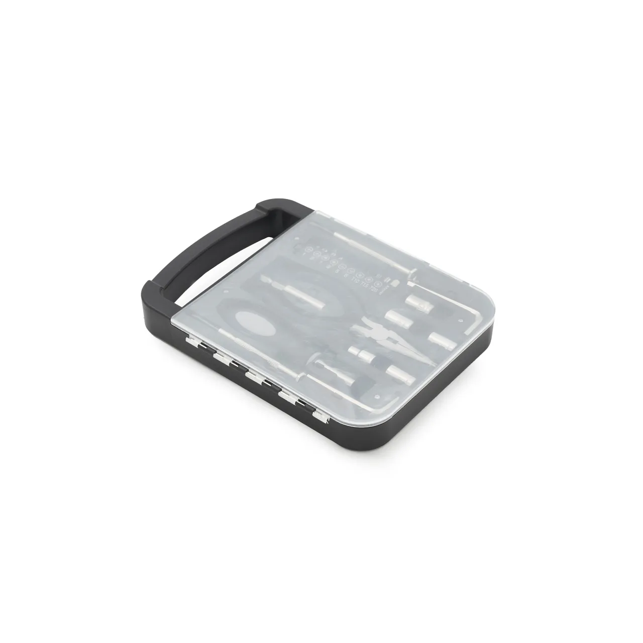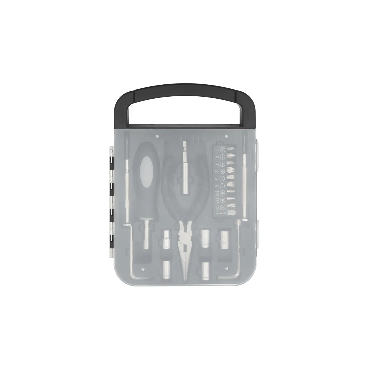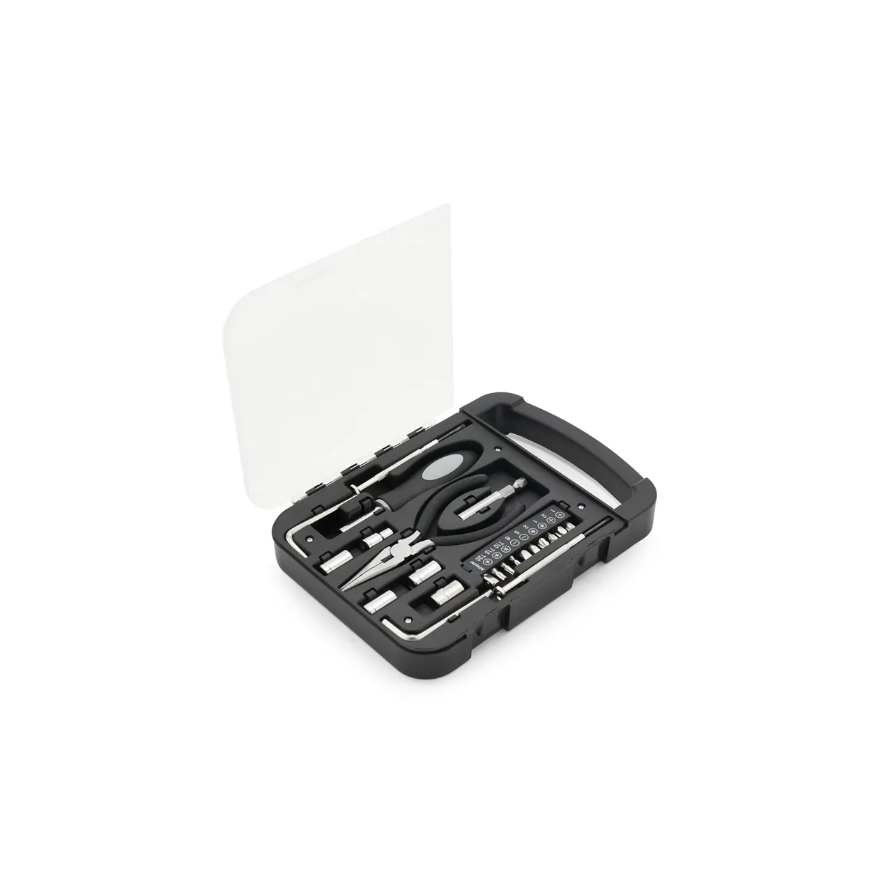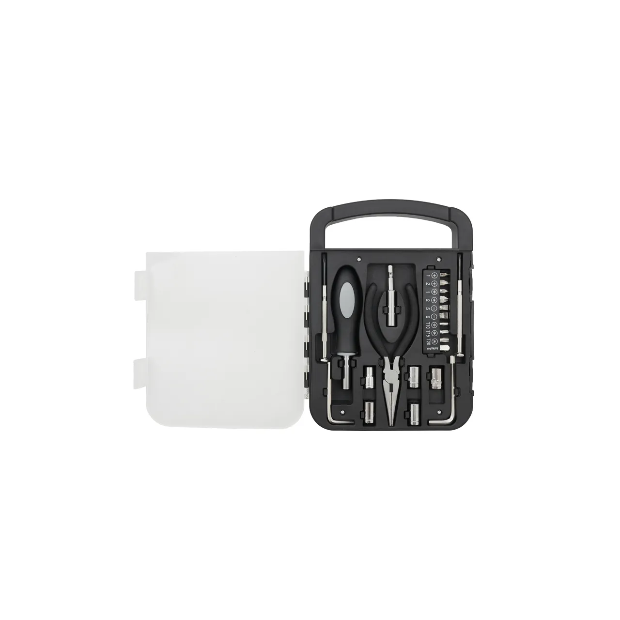 Set de herramientas, con en maletin de tapa transparente. Incluye: pinza, 2 llaves allen, destornillador de puntas intercambiables y 2 mini destornilladores Medidas: 22 x 16 x 2,7 cm. Tahg