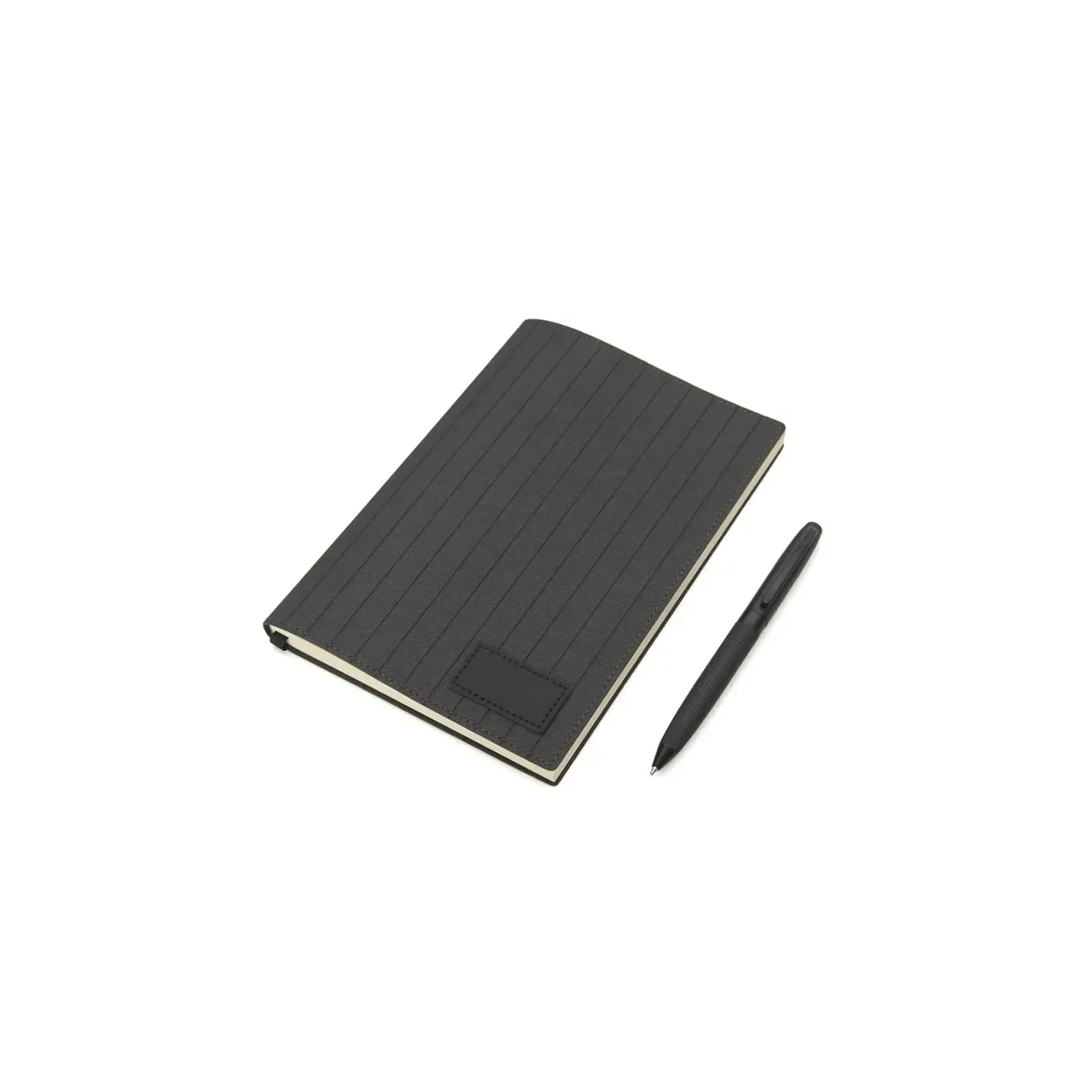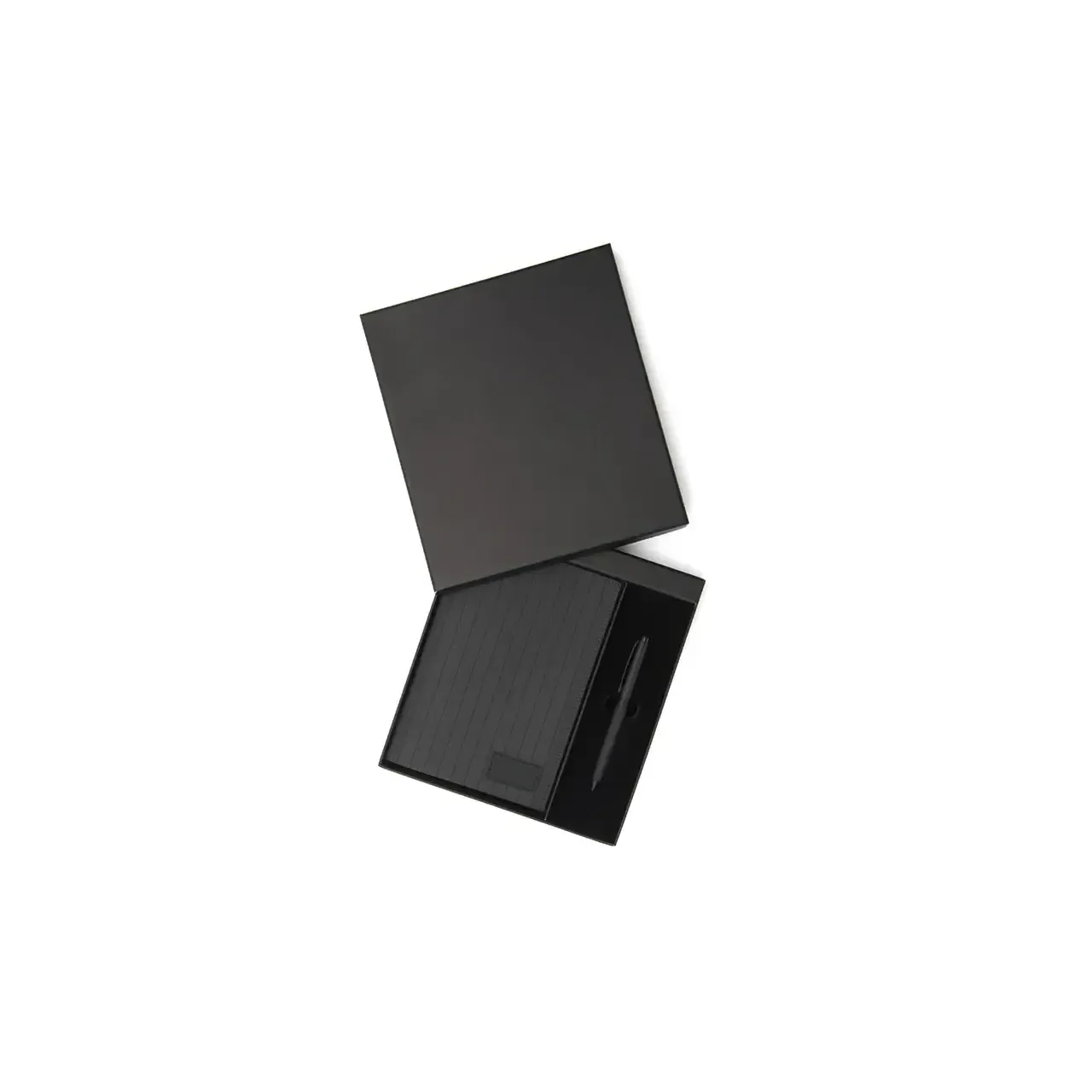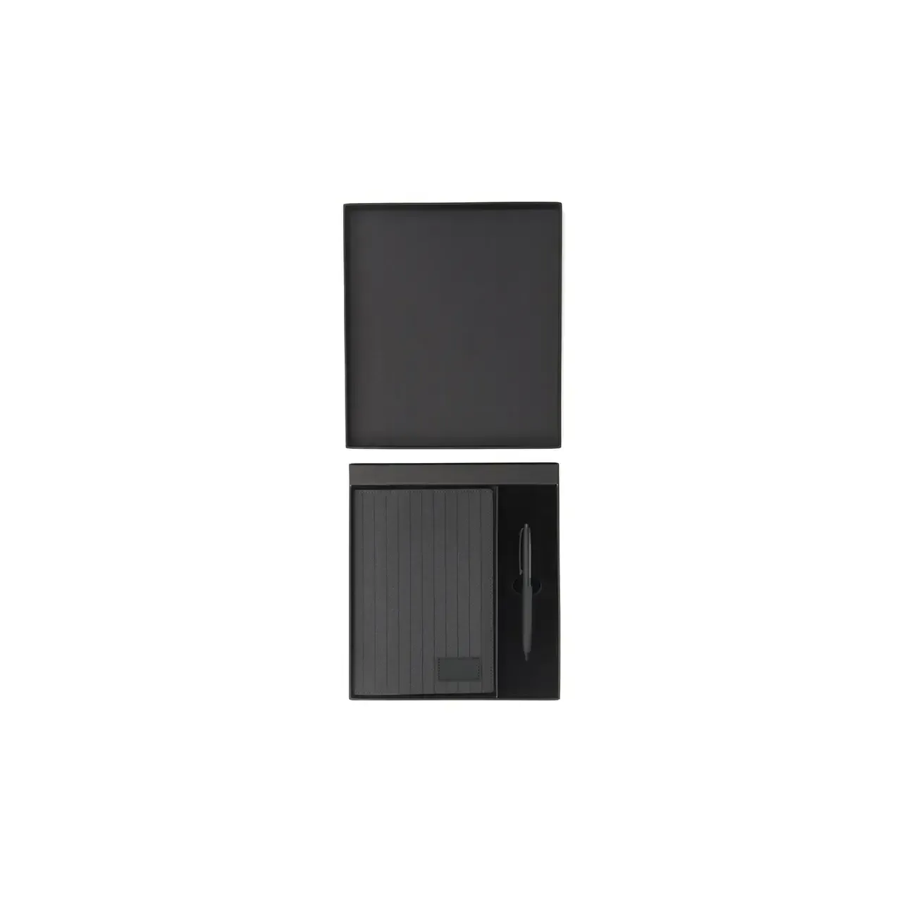 Set de cuaderno y bolígrafo fabricado con materiales de alta calidad, presentado en una caja negra laminada mate. El cuaderno está compuesto por hojas rayadas A5, cinta señaladora negra y tapa con diseño frontal lineado, mientras que el bolígrafo es ballpen metálico en color negro. Es ideal para uso profesional, reuniones de negocios, conferencias o como regalo institucional.