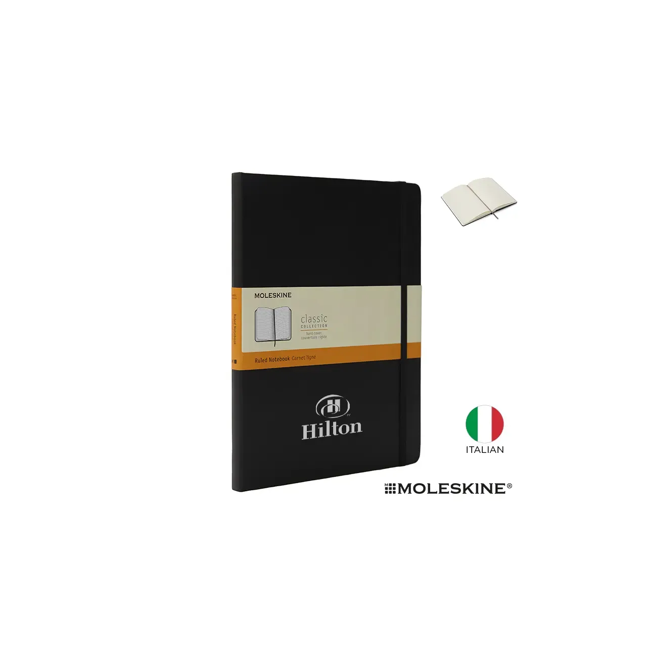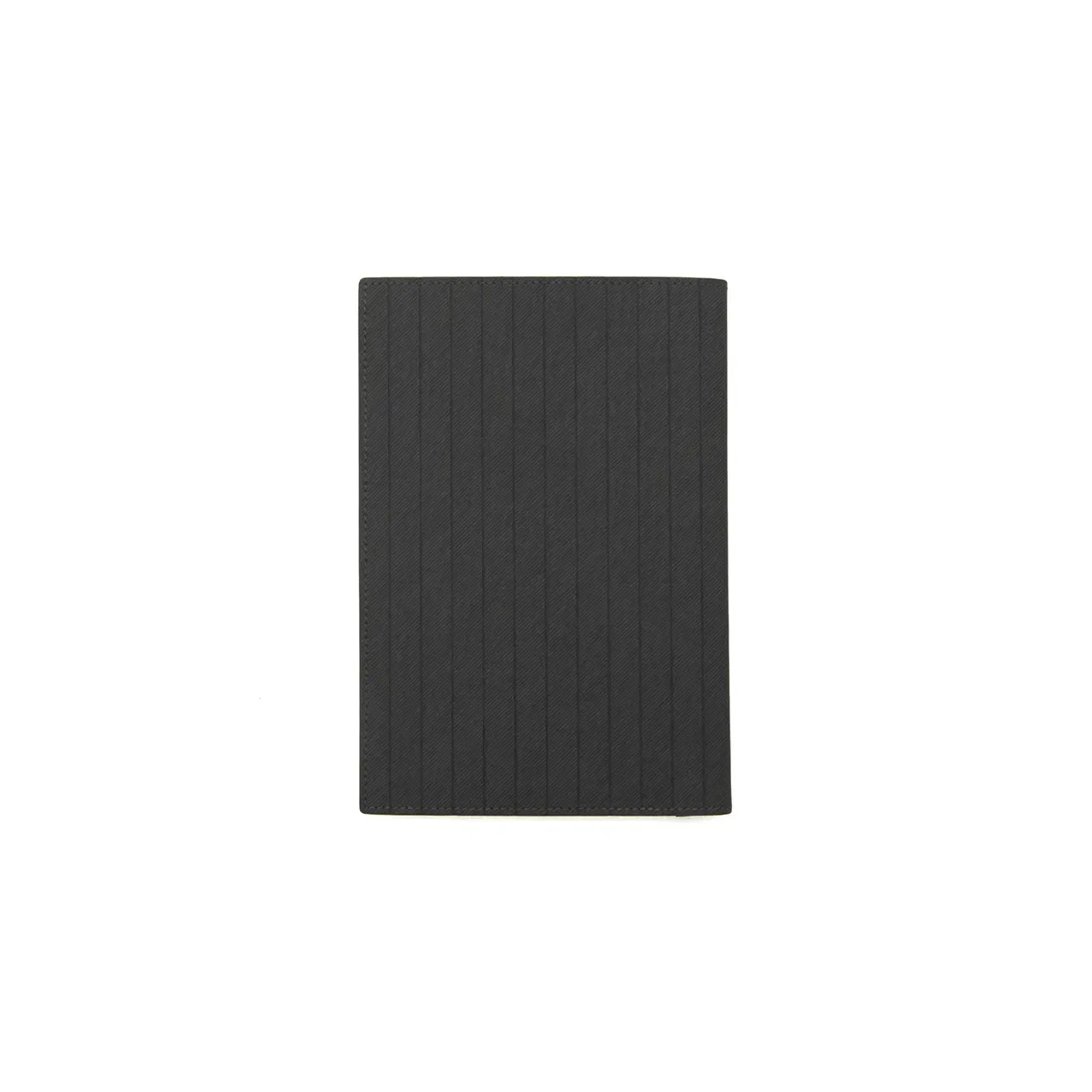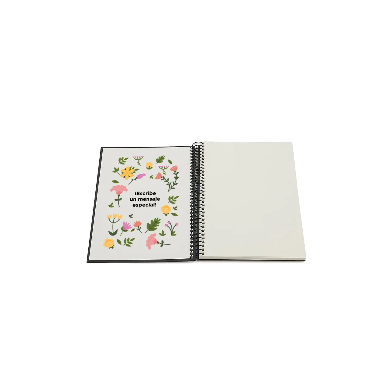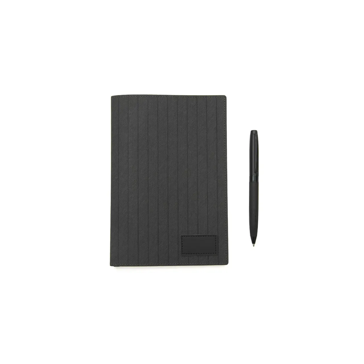 Set de cuaderno y bolígrafo fabricado con materiales de alta calidad, presentado en una caja negra laminada mate. El cuaderno está compuesto por hojas rayadas A5, cinta señaladora negra y tapa con diseño frontal lineado, mientras que el bolígrafo es ballpen metálico en color negro. Es ideal para uso profesional, reuniones de negocios, conferencias o como regalo institucional.