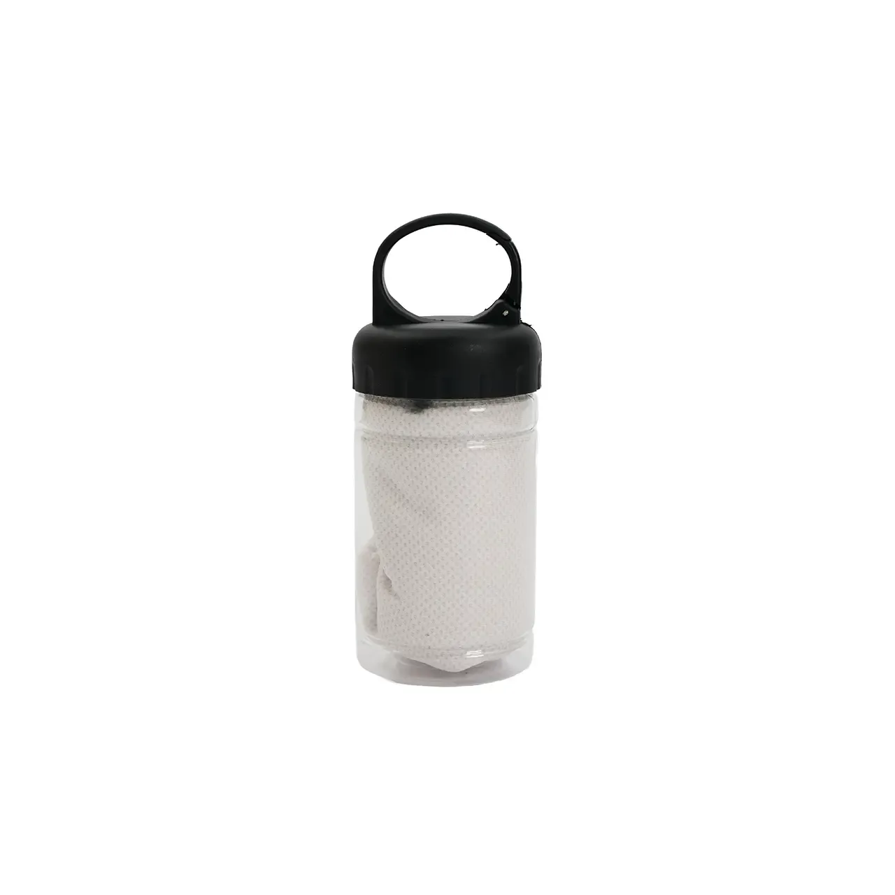Toalla con estuche portátil. Fabricada en poliéster, PET y polipropileno (PP). Cuenta con toalla de secado rápido (30 × 80 cm) y envase plástico con gancho incorporado para colgar o transportar fácilmente. Es ideal para entrenamientos, actividades al aire libre o viajes, gracias a su tamaño compacto y capacidad de secado rápido.