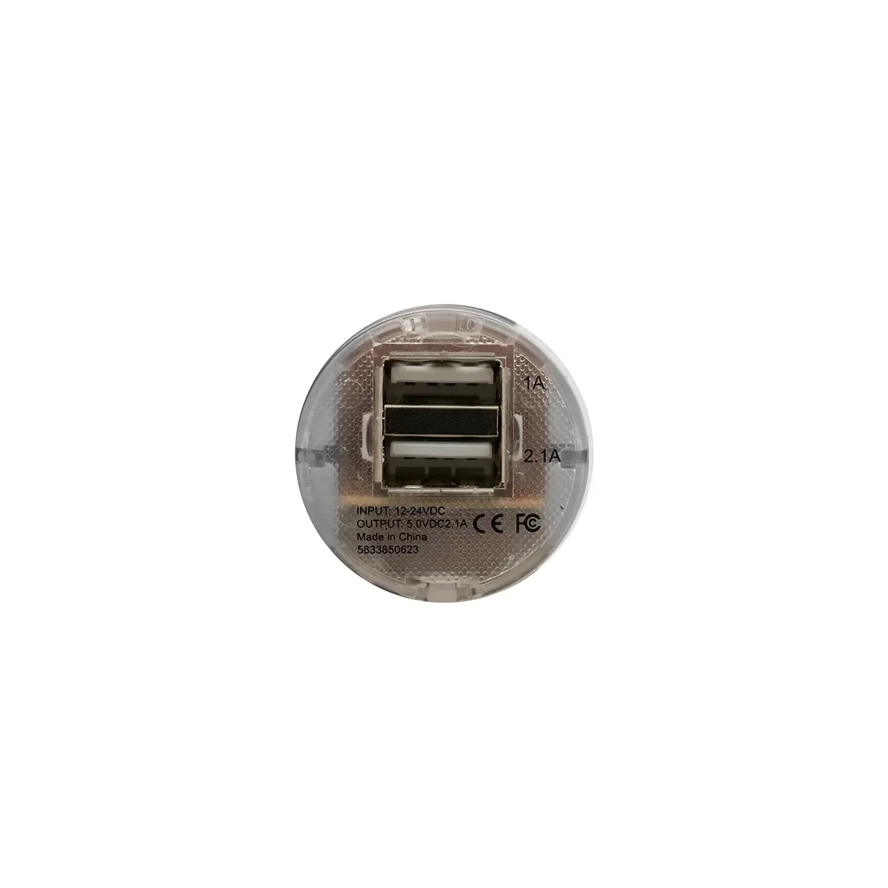 Cargador USB para automóvil en color blanco fabricado en ABS. Entrada de 12-24V y salida de 5V/1,5A. El producto viene en una caja de cartón. Dimensiones: 7,6 x 3,7 x 2,8 cm. Tahg